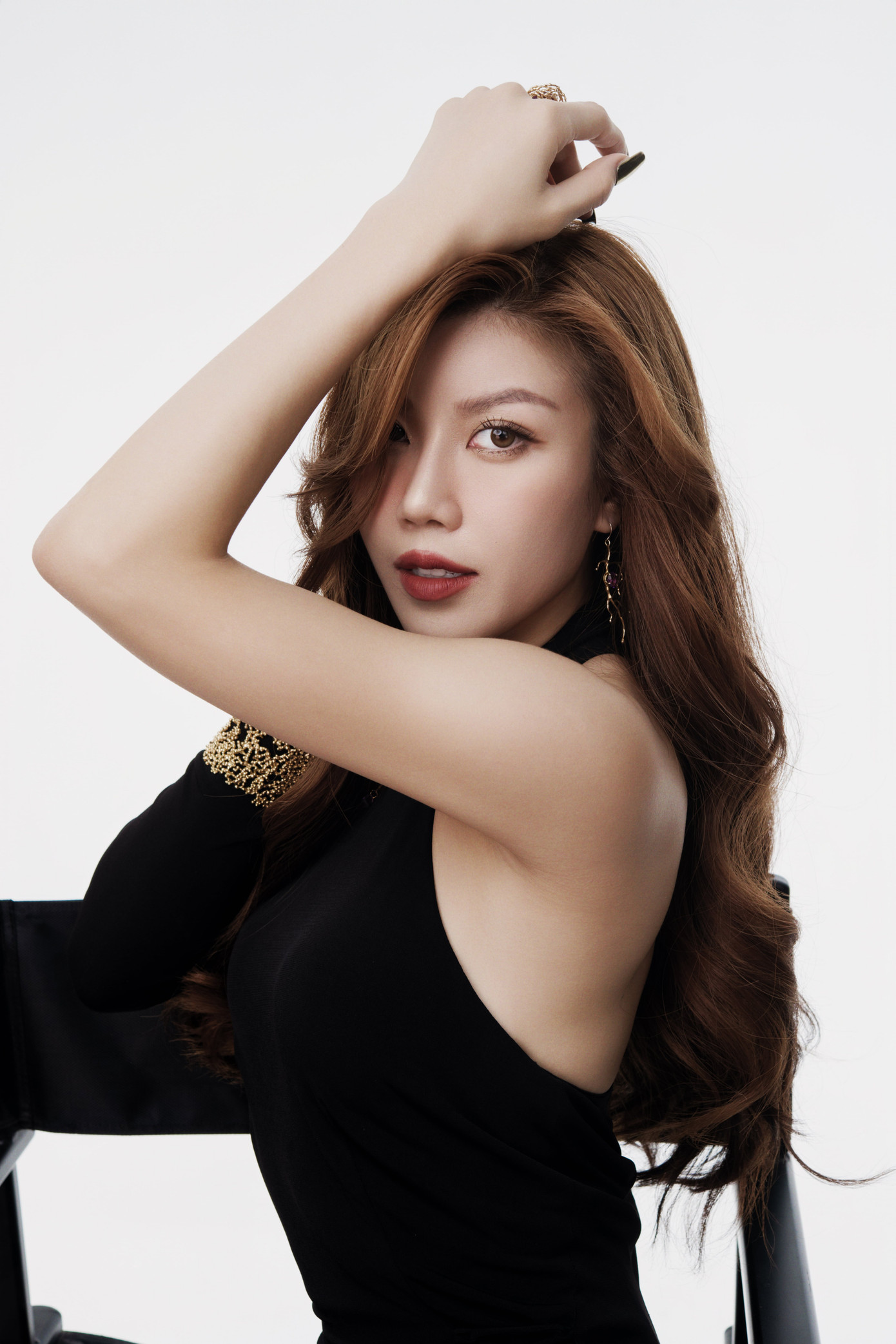 Bộ ảnh cuối cho thấy một khía cạnh khác: cá tính, đầy thần thái khi cô chụp với concept trưởng thành. Váy đen dài, phụ kiện ánh kim và phong cách làm tóc, trang điểm sang trọng tôn lên nét đẹp của một Trang Pháp hoàn thiện nhất. Cô tạo dáng cùng ghế ngồi hậu trường, đèn, hắt sáng gợi lên bối cảnh một phim trường.