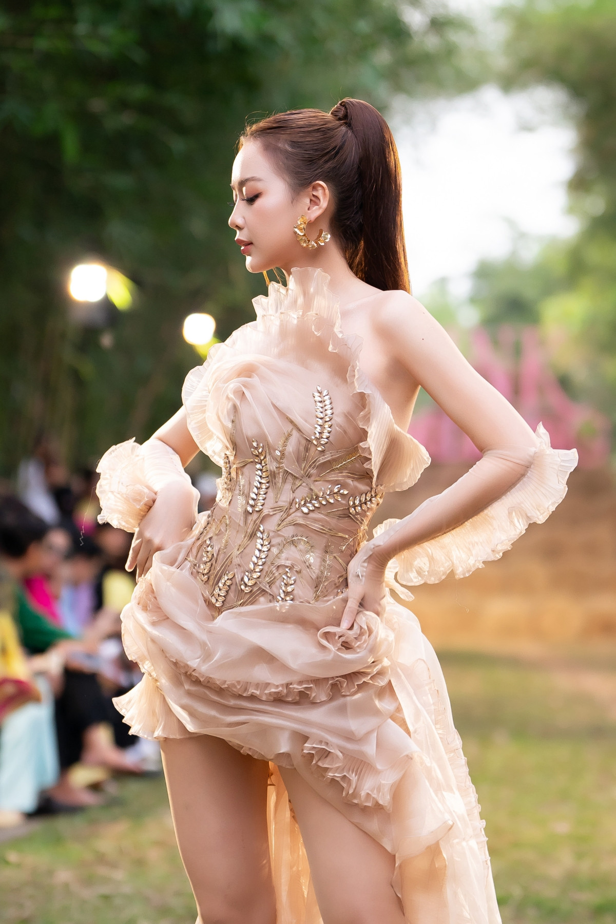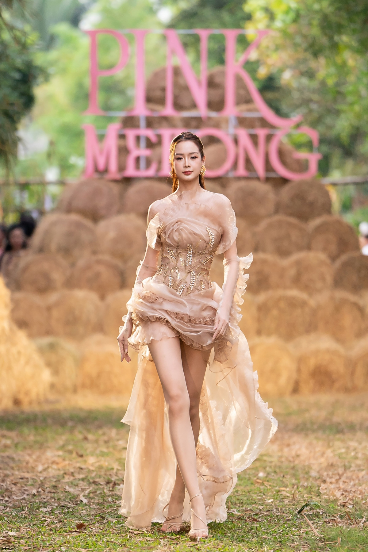Làm vedette cho bộ sưu tập Hồn Quê của NTK Tuấn Trần, Hoa hậu Liên lục địa Bảo Ngọc có phần xuất hiện đặc biệt khi đứng tạo dáng trên sân khấu rơm.