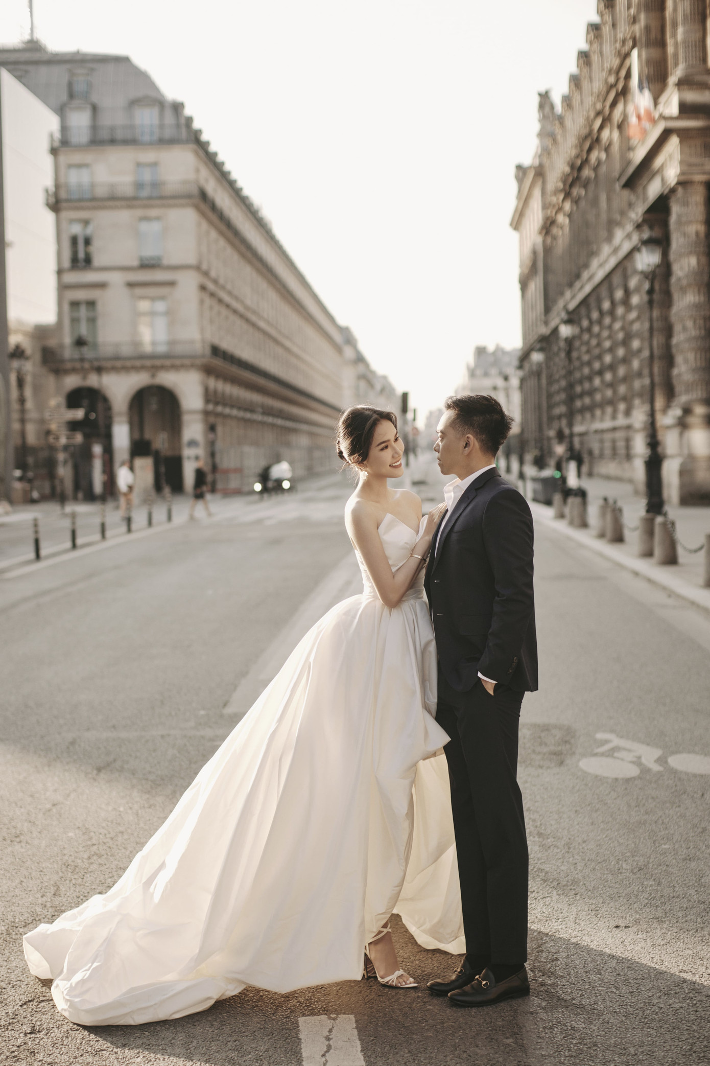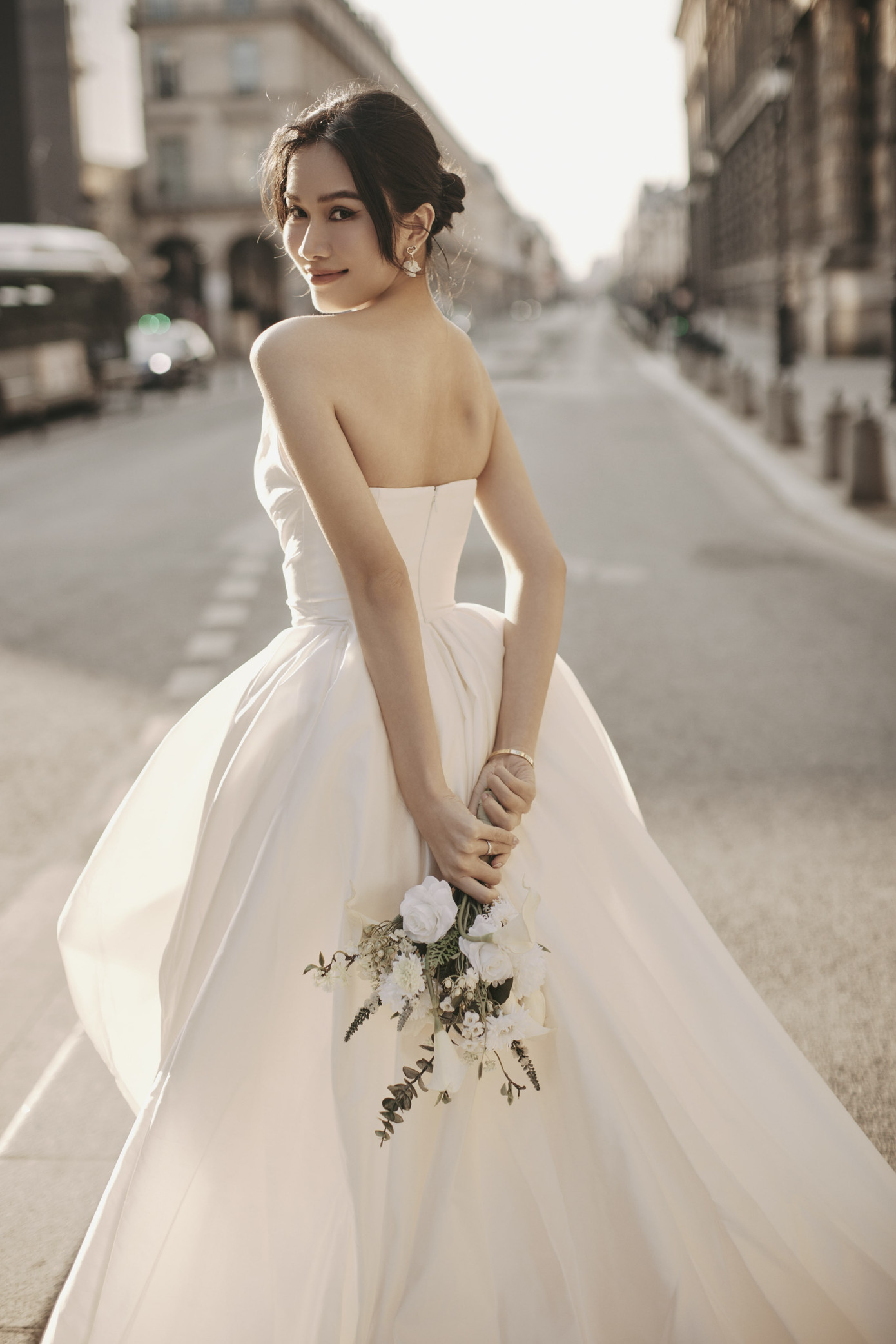 Kết hợp cùng đường phố Paris, cặp đôi Phương Anh - Đức Hồ trẻ trung với concept thứ tư. Cô dâu Phương Anh lựa chọn áo cưới crop top trơn cùng váy trơn, đậm tinh thần cổ điển châu Âu cho cô dâu ngày trọng đại. Người đẹp khoe trọn vòng eo nhỏ nhắn cũng như thể hiện nét cá tính riêng, gợi nên cảm giác tự do, phóng khoáng, thoải mái.