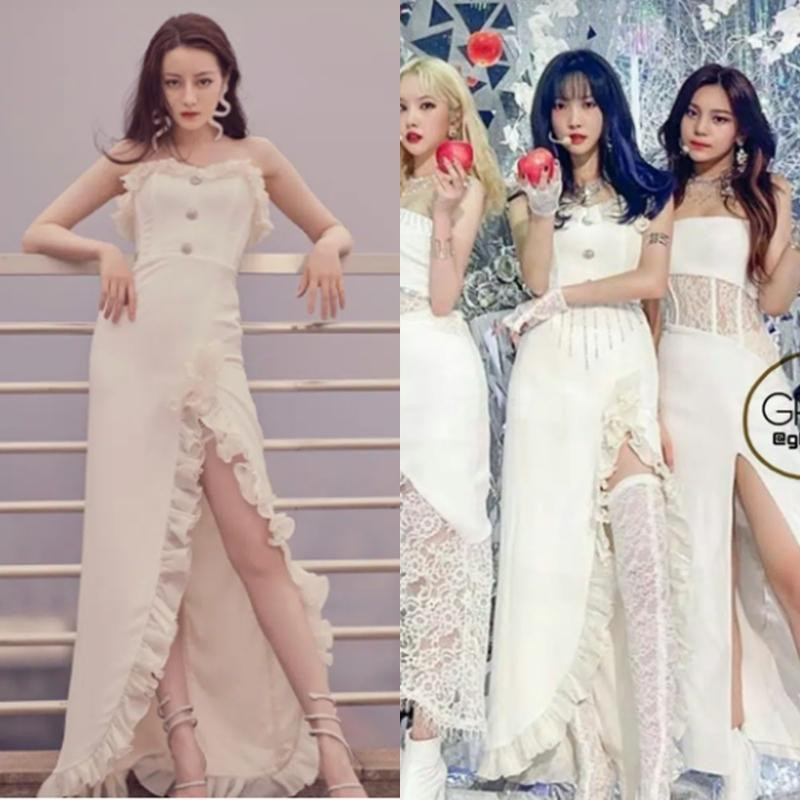 Bộ váy trắng xẻ cao vút này đã cầu kỳ lắm rồi nên Địch Lệ Nhiệt Ba chỉ cần đi thêm đôi sandal độc đáo nữa là đủ. Trong khi ấy Yuji (G-Friend) lại bị bức bí, nặng nề khi đi boot cao cổ ren trắng.