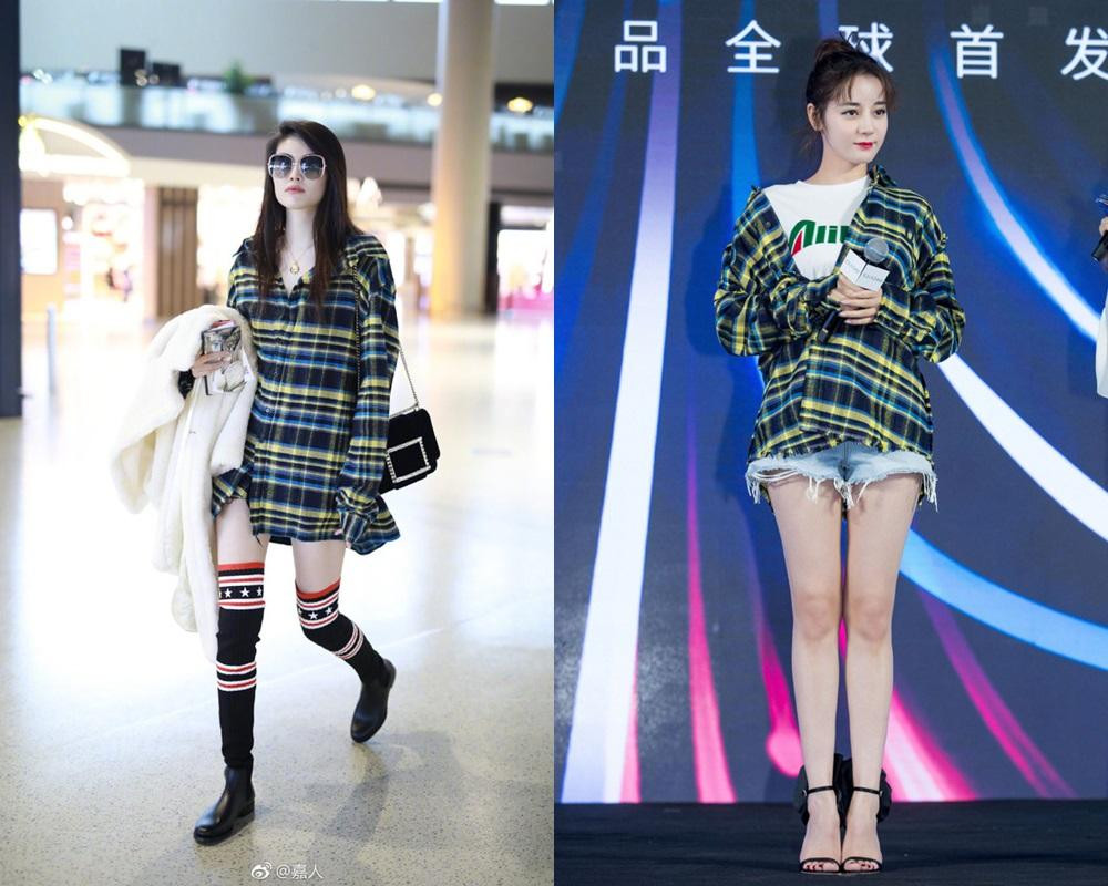 Chiếc áo sơ mi này vốn rất dài rộng nhưng Địch Lệ Nhiệt Ba vừa cắt ngắn, vừa biến thành áo lệch vai nên nhìn cá tính hơn hẳn.