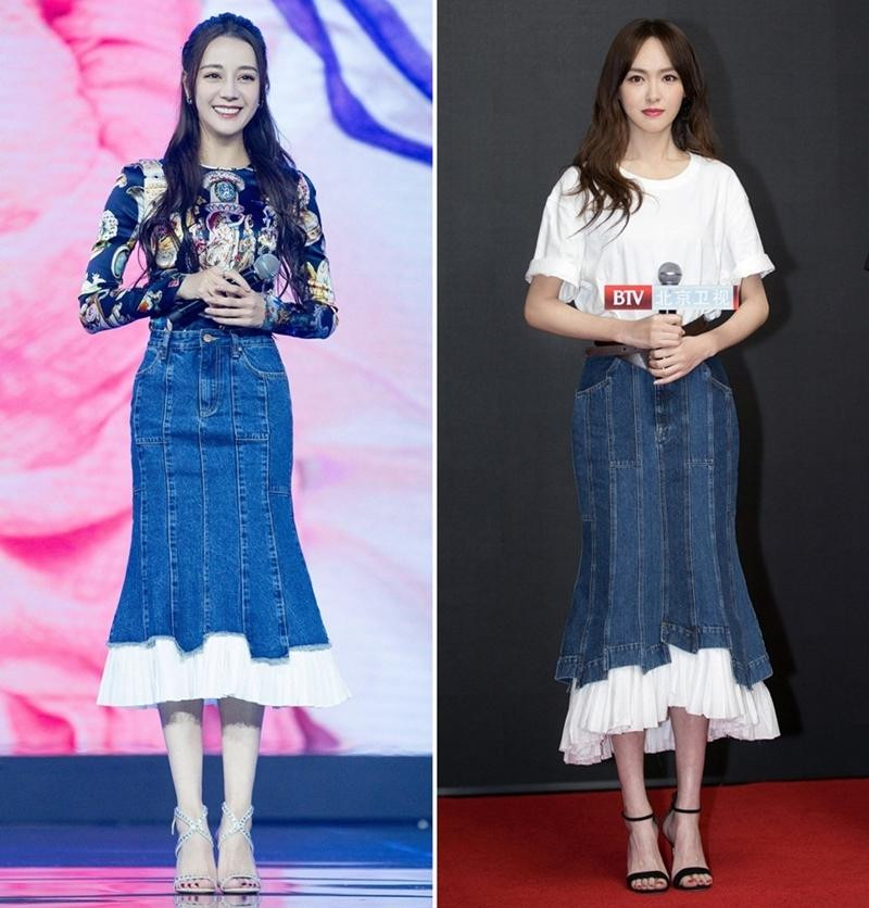Lưu Thi Thi thoạt nhìn thì có set đồ rất hài hòa nữ tính đấy, nhưng Địch Lệ Nhiệt Ba nhìn cao ráo thanh thoát hơn hẳn khi thay áo thun rộng bằng áo ôm khoe vòng eo nhỏ.