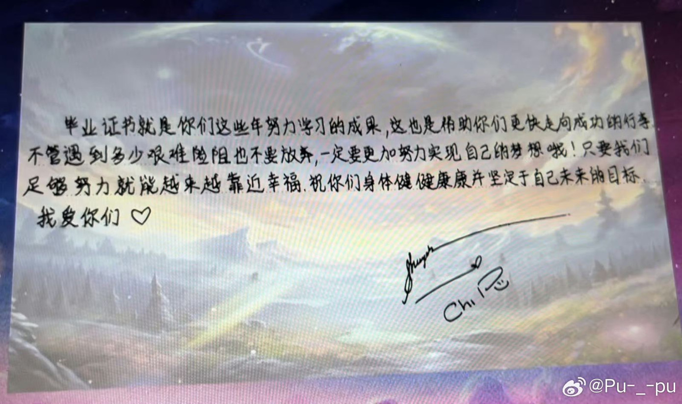 Thư tay chúc mừng sinh viên tốt nghiệp của Chi Pu cũng được công bố trong chương trình: "Bằng tốt nghiệp là thành quả mà các bạn đã miệt mài suốt những năm qua, giúp các bạn đến gần với thành công hơn, tiến tới ước mơ của các bạn! Miễn là chúng ta luôn chăm chỉ, ta sẽ ngày càng tiến xa hơn. Các bạn đang bước gần đến thành công ngọt ngào rồi. Hãy luôn mạnh khỏe, vững vàng và kiên trì với mục tiêu mà các bạn đã đặt ra nhé! Mình yêu các bạn".