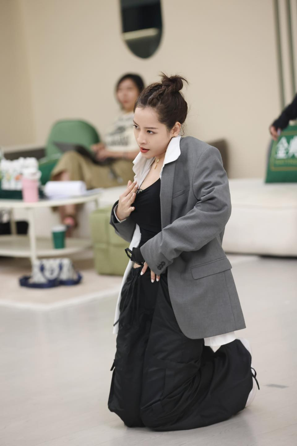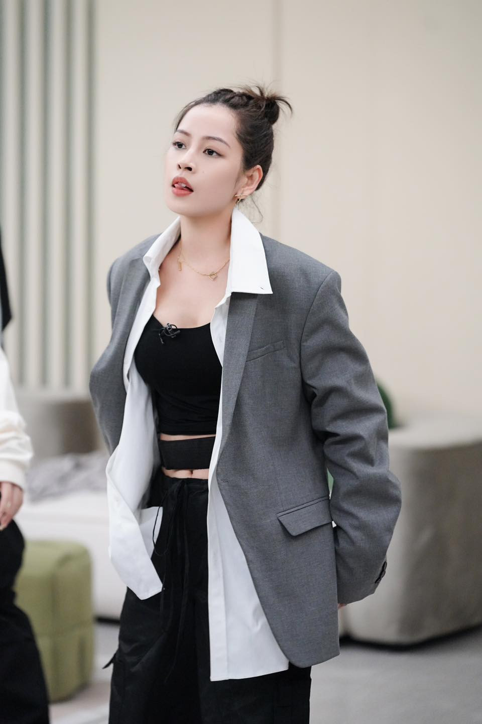 Có lúc, Chi Pu còn mặc thêm blazer xám ra ngoài để hoàn thiện thêm style phi giới tính của mình. Cũng có thể do thời gian này, Chi Pu phải thức khuya dậy sớm tập luyện cho công diễn 5 nên cô cần mặc đồ dài tay để giữ ấm. Chưa kể, stylist Hoàng Ku còn tiết lộ Chi Pu muốn mặc đồ kín để che bớt các vết bầm tím do tập múa cột gây ra.