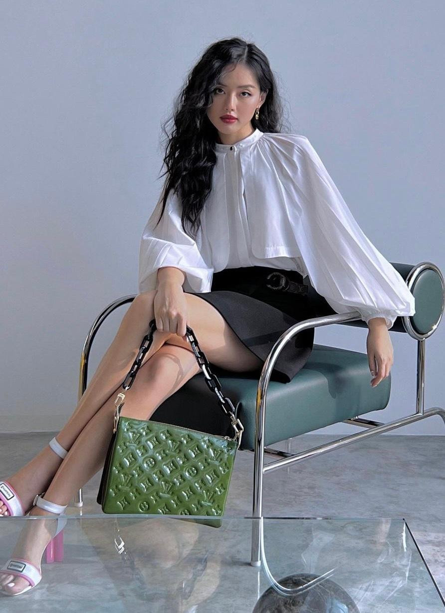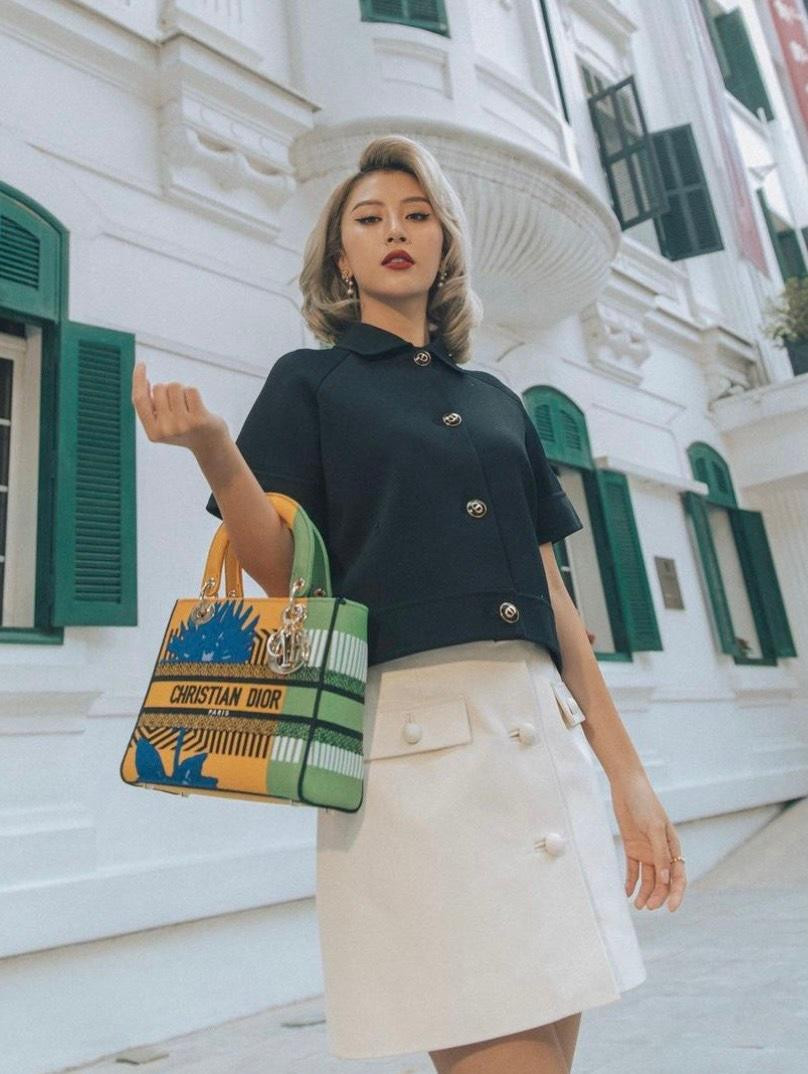 Theo đuổi phong cách thời thượng, Khánh Linh có "bí kíp" phối chân váy ngắn "xịn sò". Chỉ với mái tóc xoăn, áo sơ mi tay bồng và chân váy đen đơn giản, Khánh Linh đã "biến hình" đầy thanh lịch và cổ điển. Để sở hữu vẻ ngoài hiện đại hơn, "Cô em Trendy" chọn chân váy ngắn màu trắng, phối cùng mũ lưỡi trai và túi xách cùng màu.