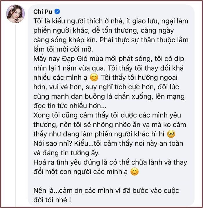 Đạp Gió 2023 là một khoảng thời gian rực rỡ đối với Chi Pu. Sau chương trình, nữ ca sĩ chẳng những có thêm nhiều hoạt động nổi bật mà còn thành công lấy lại được thiện cảm từ khán giả. Chia sẻ trong nhóm FC, giọng ca Cung Đàn Vỡ Đôi cho biết bản thân vốn là một người có lối sống khá khép kín: "Tôi là kiểu người thích ở nhà, ít giao lưu, ngại làm phiền người khác, dễ tổn thương".