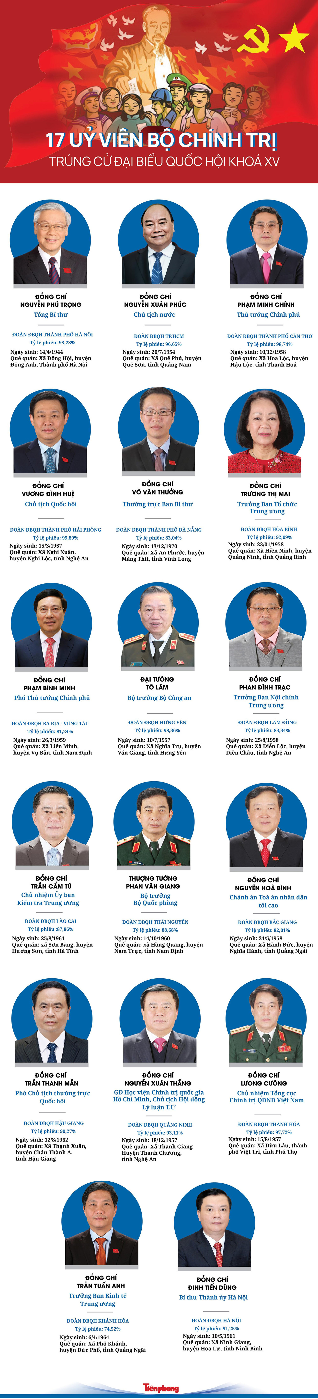TPO - Theo kết quả bầu cử Quốc hội khóa XV do Hội đồng bầu cử Quốc gia công bố chiều 10/6, 17 Uỷ viên Bộ Chính trị tham gia ứng cử đều trúng cử đại biểu Quốc hội.