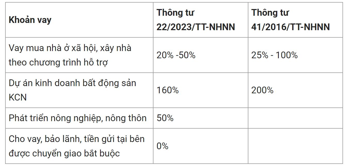 Ngoài ra, Thông tư 22 điều chỉnh hệ số rủi ro tín dụng được áp dụng đối với tài sản là khoản cấp tín dụng chuyên biệt dưới hình thức cấp tín dụng tài trợ dự án kinh doanh bất động sản khu công nghiệp xuống 160%. Trong thông tư trước đây, hệ số rủi ro được quy định chung ở mức 200% đối với tất cả các khoản cấp tín dụng tài trợ dự án kinh doanh bất động sản.