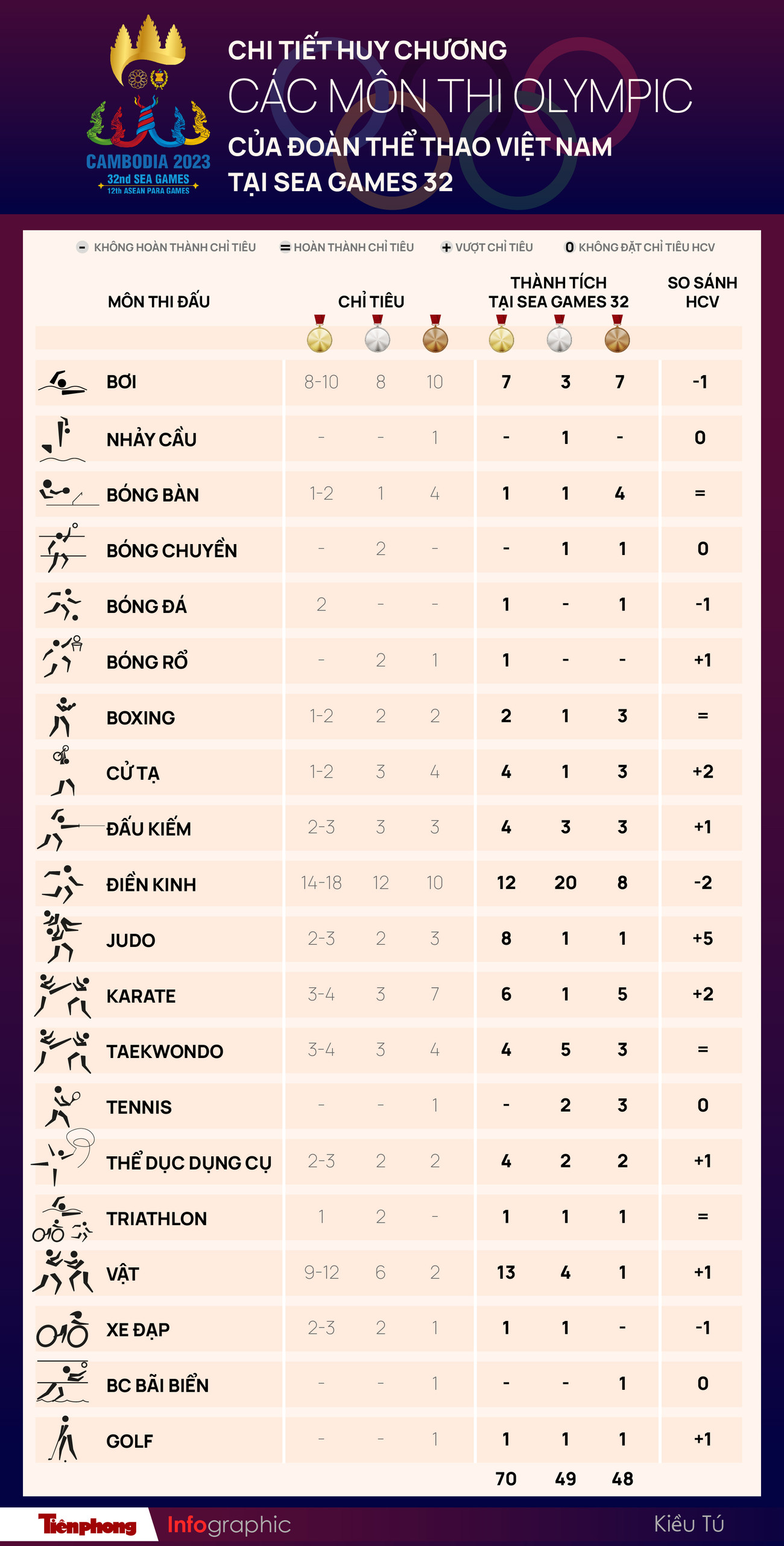 TPO - Đoàn thể thao Việt Nam đã vượt chỉ tiêu huy chương tại SEA Games 32, trong đó có nhiều môn thi Olympic. Tuy nhiên, 2 môn thi đấu cơ bản và quan trọng nhất tại Olympic là điền kinh và bơi lội cũng như môn thể thao vua lại không đạt được mục tiêu đề ra.