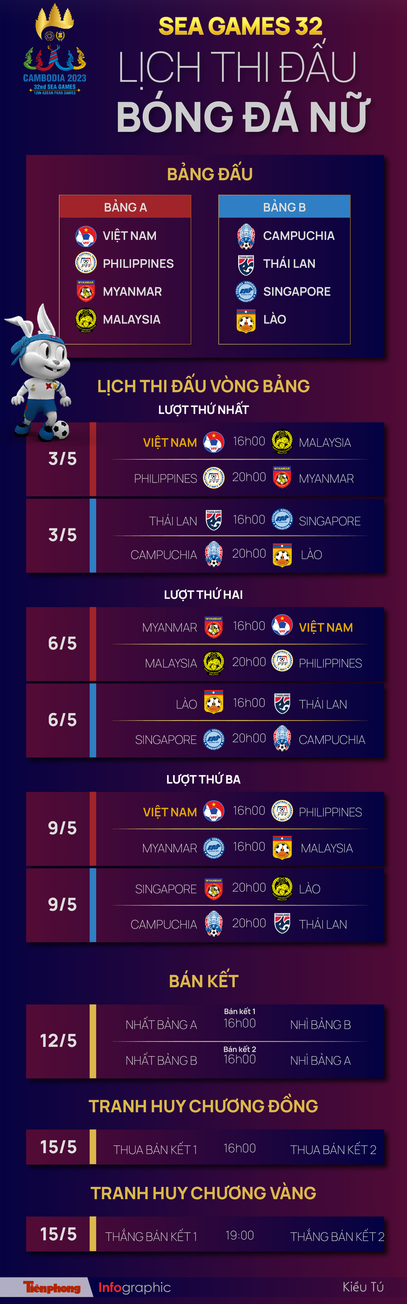 TPO - Tại SEA Games 32, đội tuyển nữ Việt Nam ở bảng A cùng Philippines, Myanmar và Malaysia. Bảng B gồm có chủ nhà Campuchia, Thái Lan, Singapore và Lào.