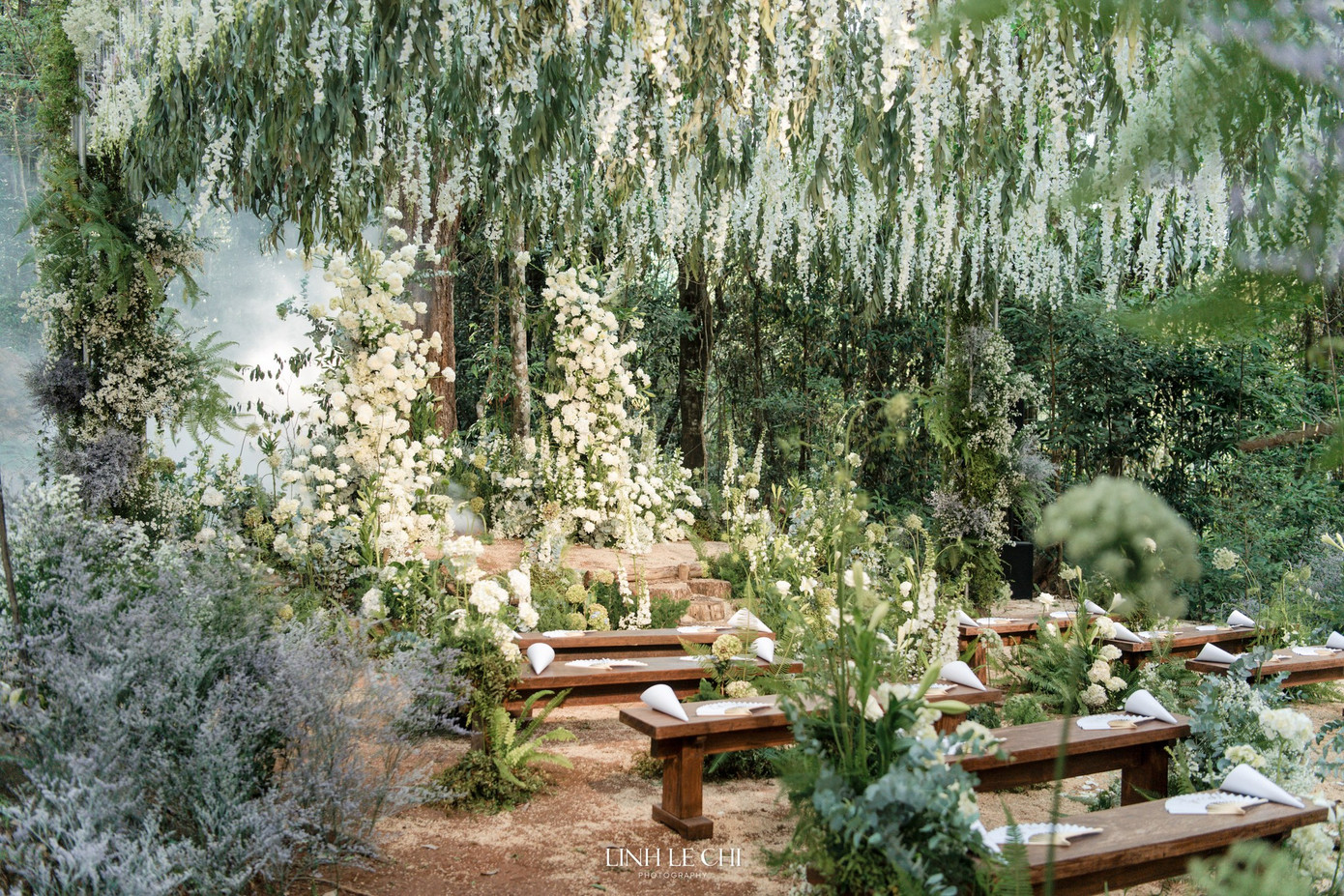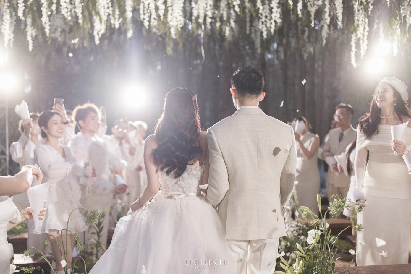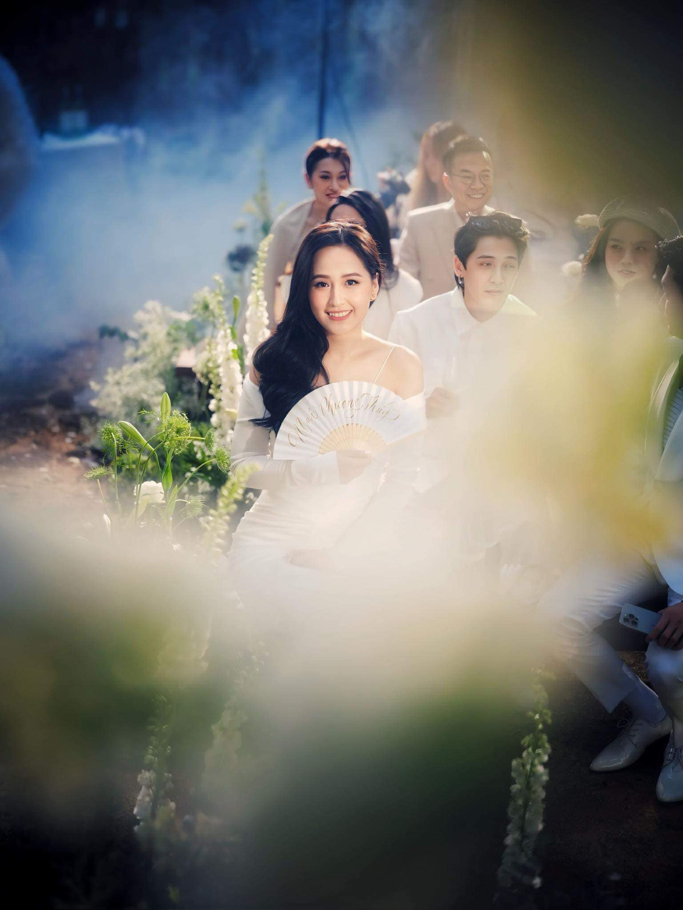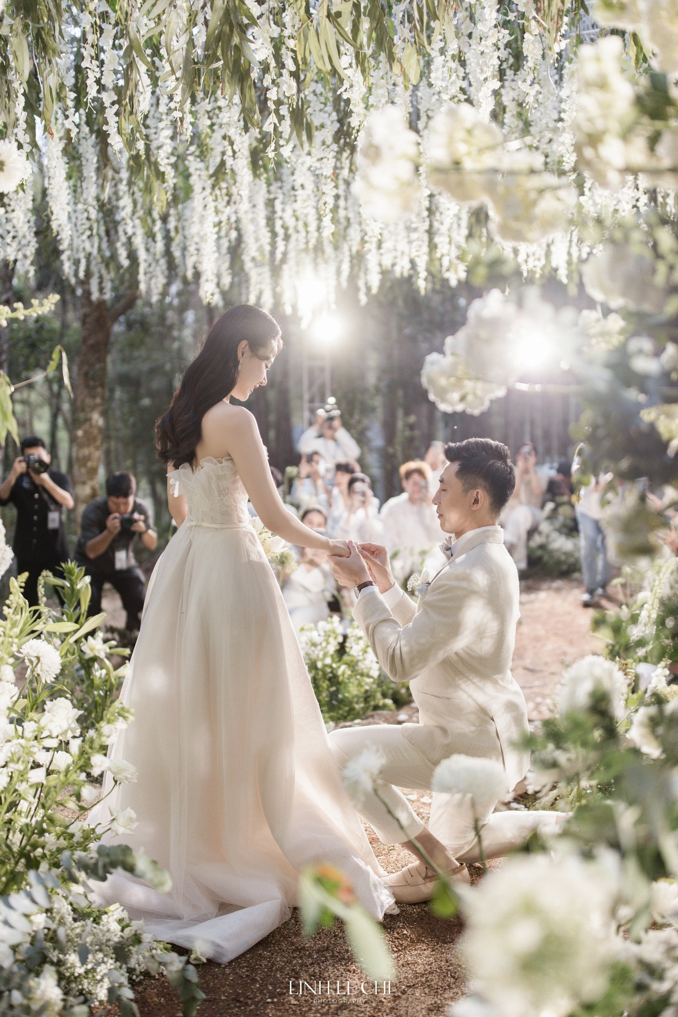 Trong tiệc cưới riêng tư này, Midu mong muốn các khách mời mặc đồ màu trắng cho hài hòa với bối cảnh. Khung cảnh chỉ có hai màu xanh lá và trắng của hoa, của trang phục nhưng không hề đơn điệu, ngược lại càng thêm sang trọng.