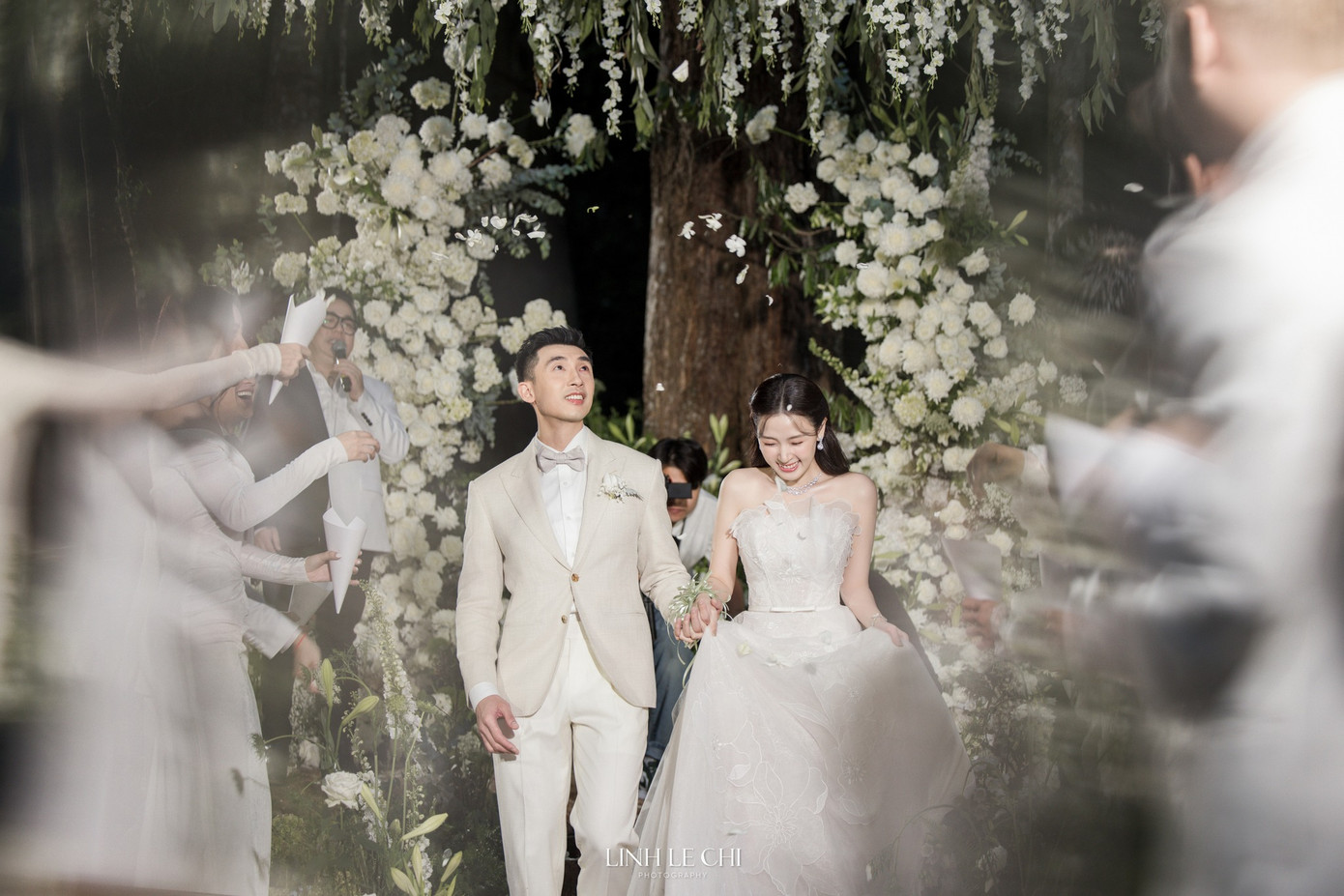 Hóa ra bên trong phễu đựng đầy cánh hoa, để mọi người tung lên sau khi Midu và doanh nhân Minh Đạt thực hiện xong lễ cầu hôn. Khoảnh khắc cô dâu chú rể hạnh phúc bước đi giữa hai hàng khách mời, ai cũng hân hoan tung hoa chúc mừng đôi vợ chồng được khen là đẹp hơn cả trên phim.