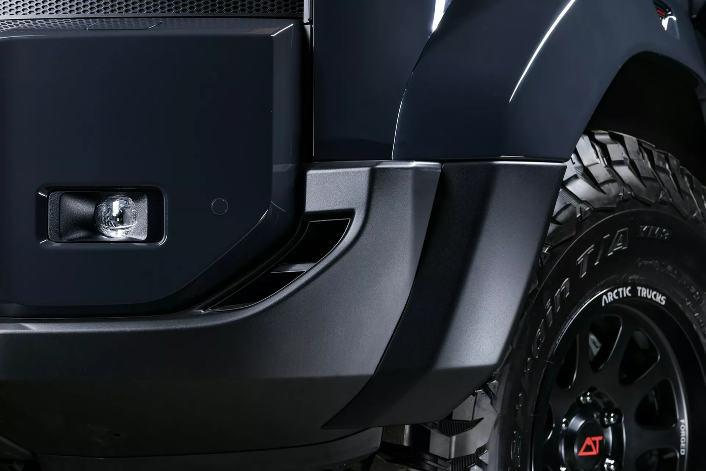 Về tổng thể, mẫu Prado AT37 có vẻ ngoài mạnh mẽ và hầm hố hơn nhờ bộ bodykit độ thân rộng. Các chi tiết nổi bật được bổ sung bao gồm cản trước/sau mới và các vòm bánh mở rộng. Ngoài ra, xe còn có bậc bước bằng nhôm, chắn bùn kim loại và bộ tời đặt ẩn.