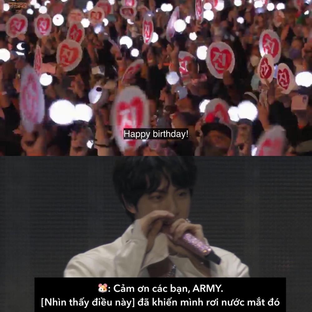 Trong ngày concert cuối cùng, Jin đã rớt nước mắt vì hạnh phúc khi nhìn thấy các dự án sinh nhật mình được ARMY thực hiện ngay trên sân vận động SoFi. Hàng loạt trái tim in tên Jin, và rất nhiều mảnh cắt hình Mặt Trăng (theo tên ca khúc Moon do Jin thể hiện), đã được fan dán lên cây gậy cổ vũ bomb, trải khắp sân vận động.