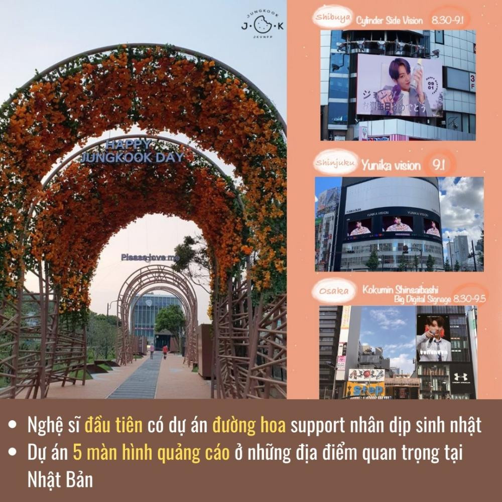Nhân dịp sinh nhật Jung Kook, fanbase của nam idol trên khắp thế giới cũng đã thực hiện tới hơn 300 dự án lớn nhỏ mừng em út vàng tròn 24 tuổi. Ngoài những dự án thiện nguyện vô cùng ý nghĩa, hình ảnh của Jung Kook cũng tràn ngập trên khắp đường phố của thủ đô Seoul và tại nhiều khu trung tâm của các thành phố lớn trên thế giới, thậm chí cả đến màn hình của gần 7000 cây ATM cũng có hình ảnh của nam idol.