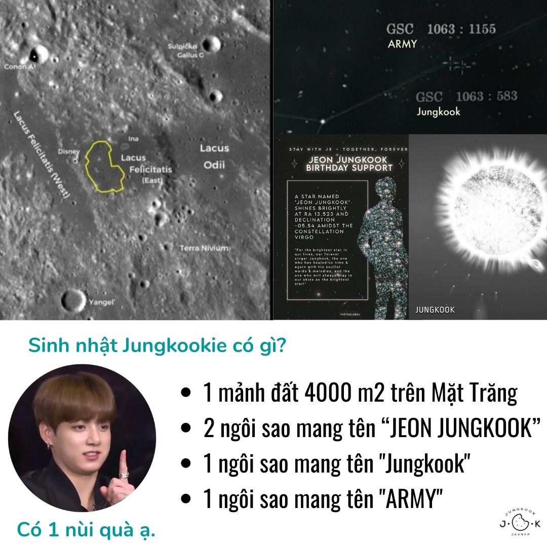 Năm nay, người hâm mộ cũng biến Jung Kook thành nam idol sở hữu “bất động sản” ngoài vũ trụ nhiều nhất thế giới. Fanbase của anh tại Singapore đã mua 1 mảnh đất rộng 4000 mét vuông đất trên Mặt Trăng và đặt tên là JEON JUNGKOOK, một số fanbase và người hâm mộ cũng đã mua tổng cộng 4 ngôi sao trong vũ trụ làm quà tặng cho Jung Kook.