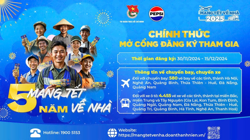 T.Ư Đoàn TNCS Hồ Chí Minh phối hợp với Công ty TNHH Nước Giải khát Suntory PepsiCo Việt Nam triển khai chương trình "Mang Tết về nhà" năm 2025, nhằm hỗ trợ sinh viên, thanh niên công nhân và người lao động có hoàn cảnh khó khăn tại TP. HCM, Đồng Nai, Bình Dương có quê tại các tỉnh miền Trung, Tây Nguyên và miền Bắc, về quê đón Tết Nguyên đán Ất Tỵ.