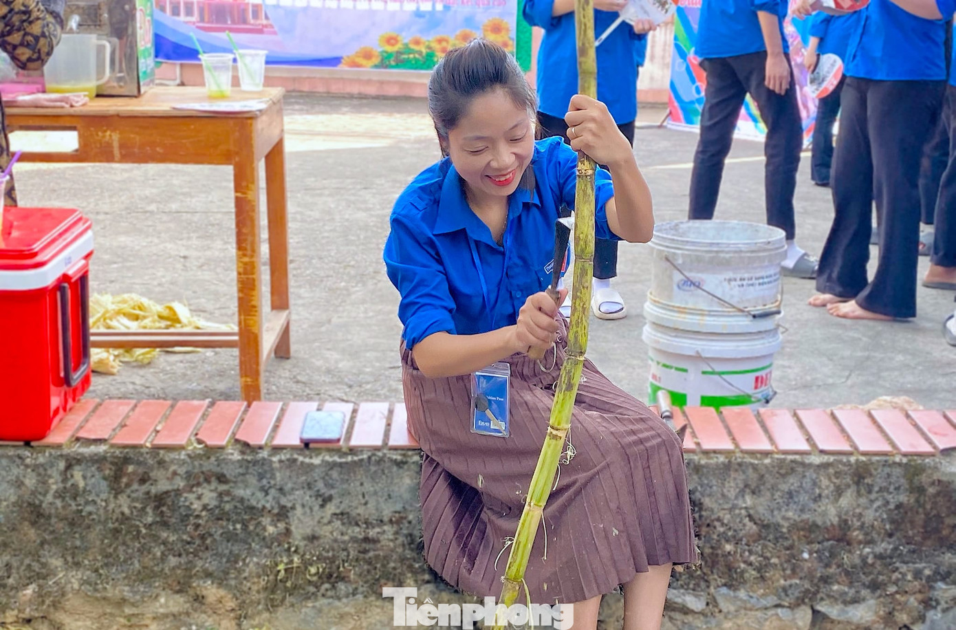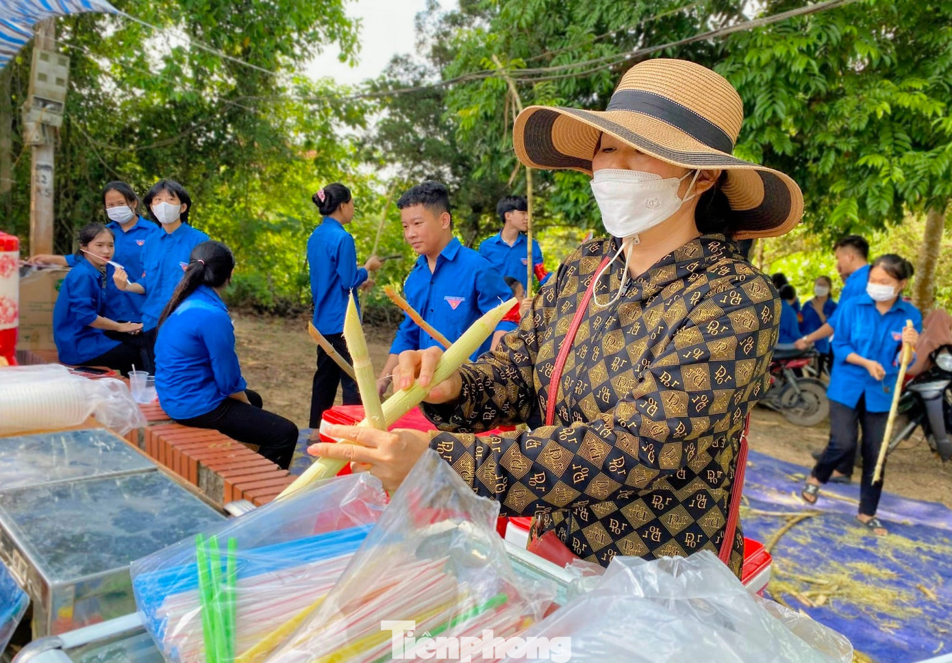 | Các đoàn viên tình nguyện mỗi người hỗ trợ một công việc như nạo vỏ mía, ép nước, rót và trao tặng các thí sinh. |