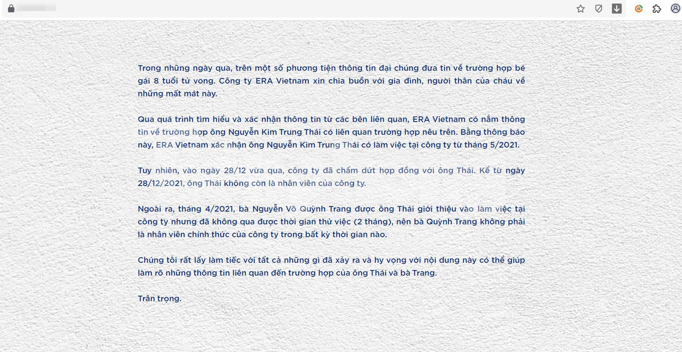 Đại diện công ty này cũng xác nhận, bà Nguyễn Võ Quỳnh Trang (người bạo hành cháu bé) cũng từng được ông N.K.T.T giới thiệu vào công ty làm việc, nhưng do không đáp ứng được yêu cầu công việc trong thời gian 2 tháng thử việc, nên bà Trang không được công ty tuyển dụng.