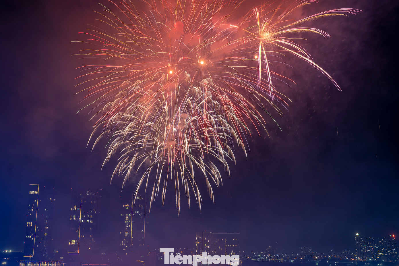 | Đúng 0h, pháo hoa chào năm mới nổ vang, bung tỏa trên bầu trời TPHCM. |