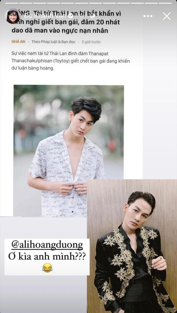 Đúng khi này, nữ diễn viên Khánh Vân bỗng dưng đăng tải hình của thủ phạm Thanapat Thanachakulphisan cạnh ca sĩ Ali Hoàng Dương, còn gắn thẻ tài khoản của nam ca sĩ vào như muốn nói nhìn Ali Hoàng Dương rất giống nam diễn viên người Thái.