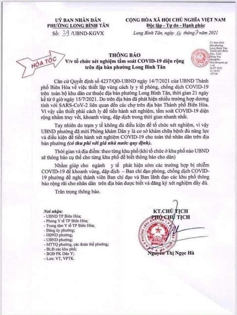 Ngày 16/7, Phó chủ tịch UBND phường Long Bình Tân (TP Biên Hòa) Nguyễn Thị Ngọc Hà ký công văn “hỏa tốc” về việc tổ chức xét nghiệm tầm soát COVID-19 diện rộng trên địa bàn phường.