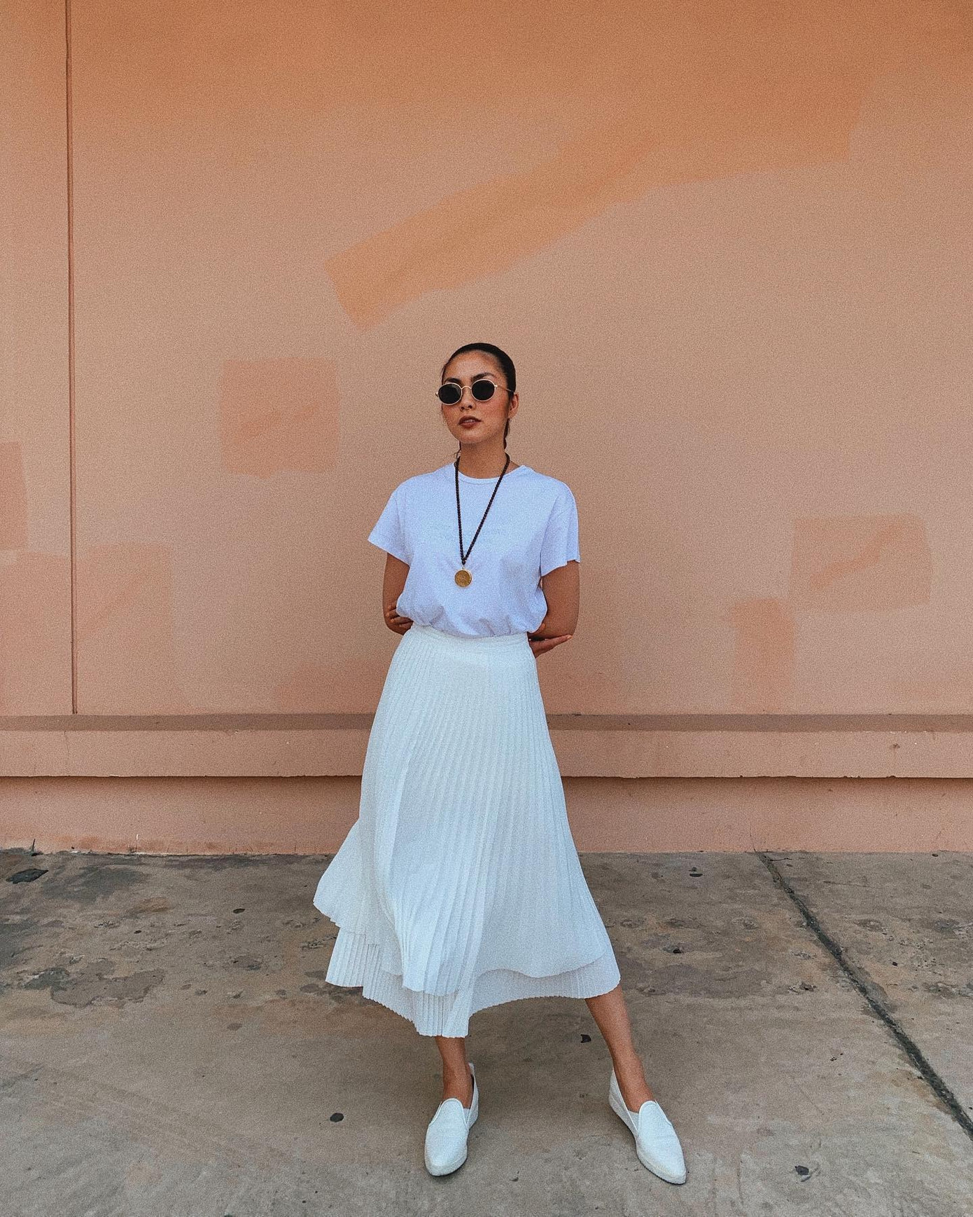 Ngay cả khi chọn một chiếc váy trắng đứng trước bức tường trắng, nữ diễn viên vẫn tạo được điểm nhấn là ô cửa sổ xanh lá. Từ đó mà bộ váy của cô không hề bị chìm vào nền tường.