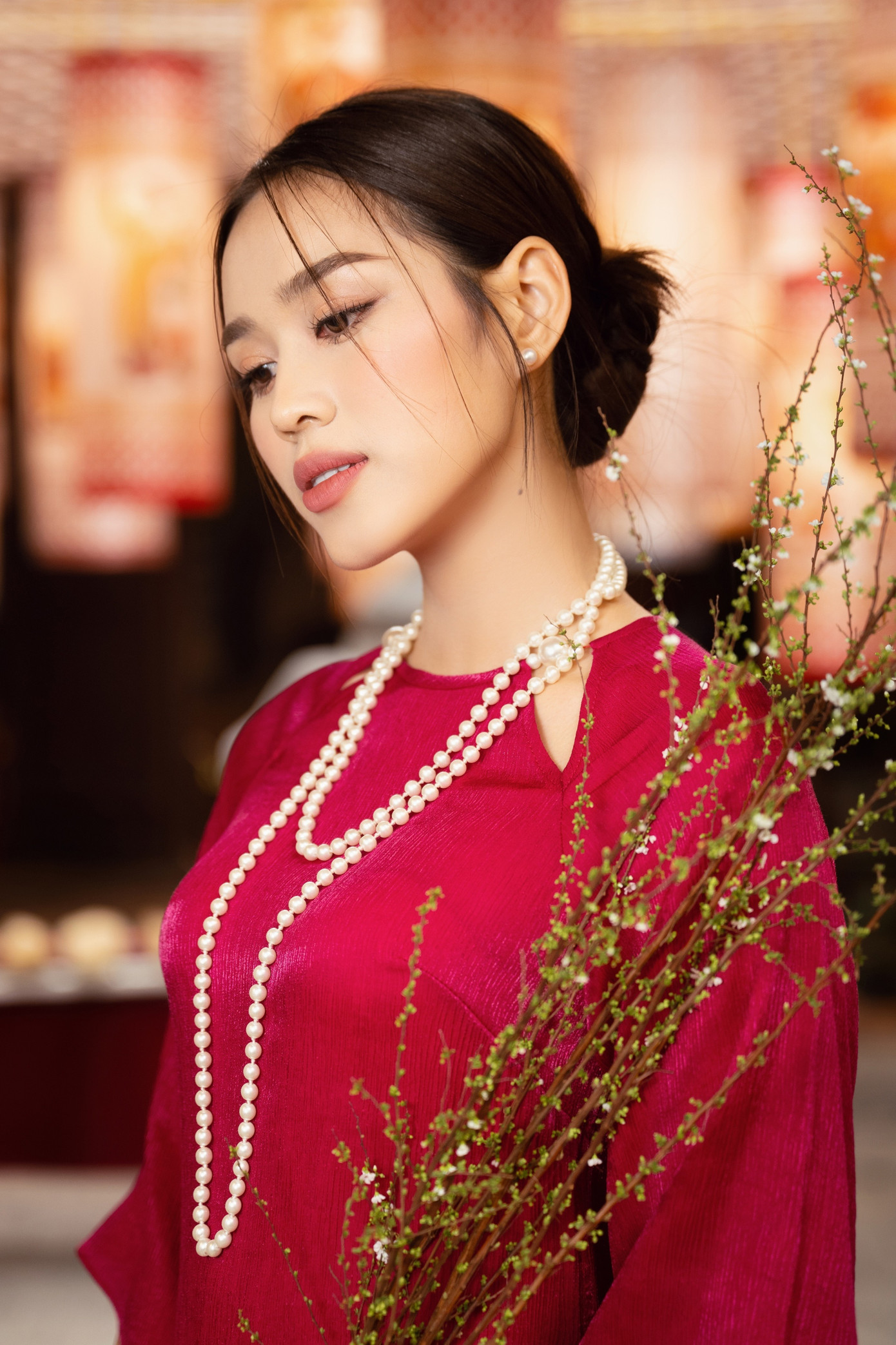 Đặc điểm của Thùy Tiên khi mặc áo dài là đội thêm mấn hoặc băng đô cùng màu áo. Nhờ vậy, nàng hậu có thêm điểm nhấn trên mái tóc, nhìn càng dịu dàng thanh nhã.