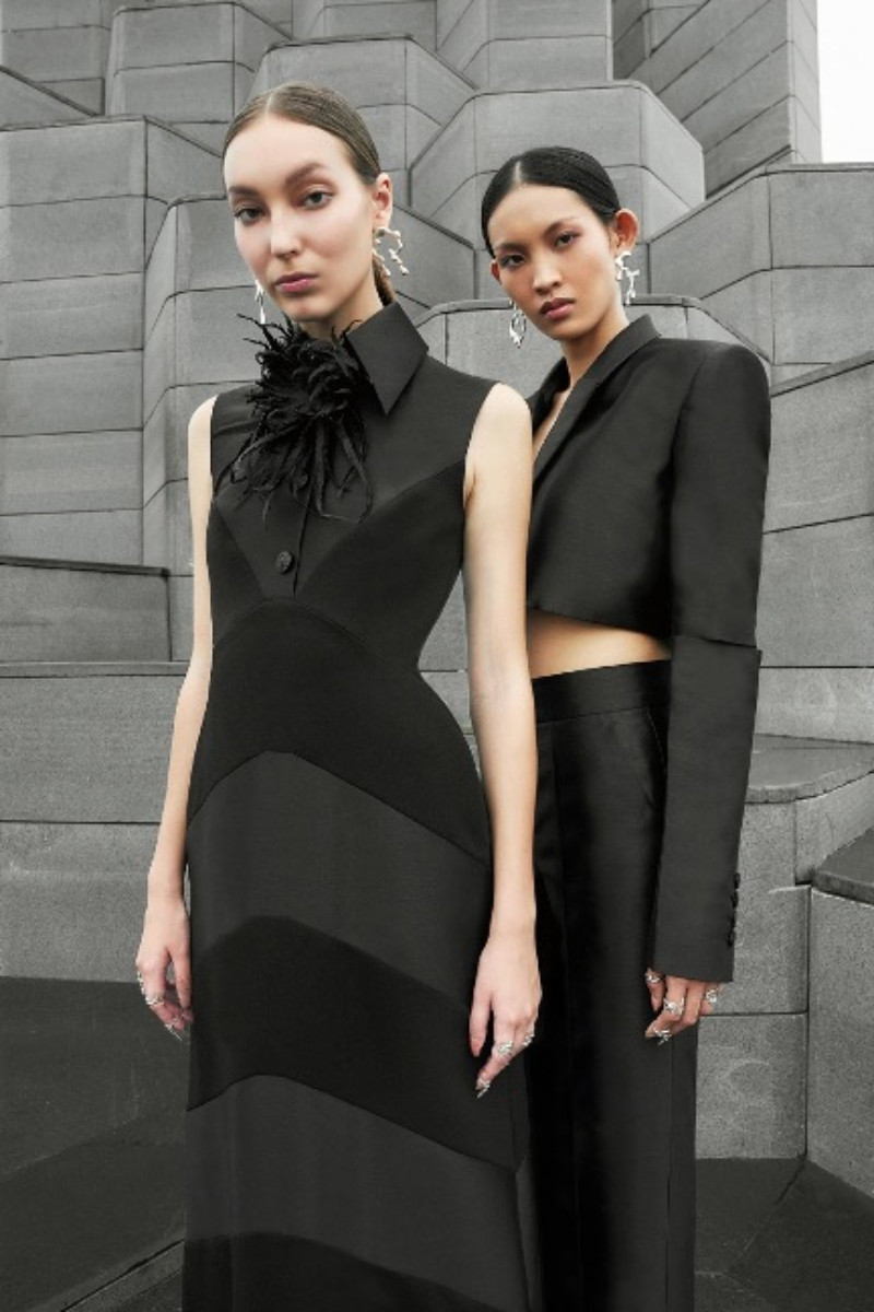 Thiết kế này được may từ chất liệu taffeta và wool crepe. Riêng vải taffeta được NTK Công Trí đặt hàng từ bên Ý và đã trải qua phương pháp xử lý đặc biệt, chỉ có tại nhà mốt, góp phần tạo nên một bản sắc thời trang của riêng CONG TRÍ khi đặt cạnh các tên tuổi lớn khác trên thế giới.