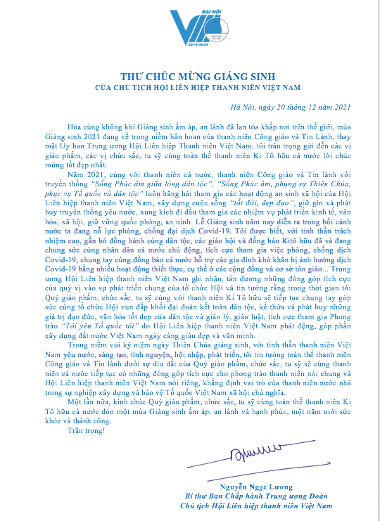 Thay mặt Ban Bí thư T.Ư Đoàn, Thường trực Đoàn Chủ tịch Ủy ban T.Ư Hội LHTN Việt Nam, anh Nguyễn Ngọc Lương đã gửi lời chúc tới các linh mục, mục sư và toàn thể giáo dân đón mùa Giáng sinh an lành, hạnh phúc.