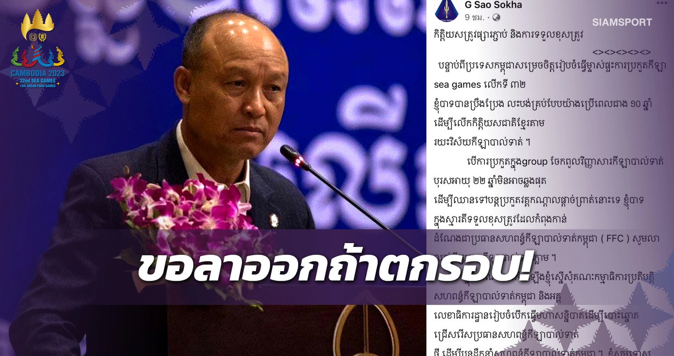 Nếu điều này xảy ra, tôi đề nghị Ủy ban điều hành LĐBĐ Campuchia và Tổng thư ký tổ chức một cuộc họp để bầu ra chủ tịch mới để tiếp tục thay tôi điều hành. Tôi xin lỗi những người hâm mộ thân yêu. Hãy thứ lỗi nếu tôi không thể dẫn dắt đội tuyển quốc gia đạt được thành công mà chúng ta mong đợi".