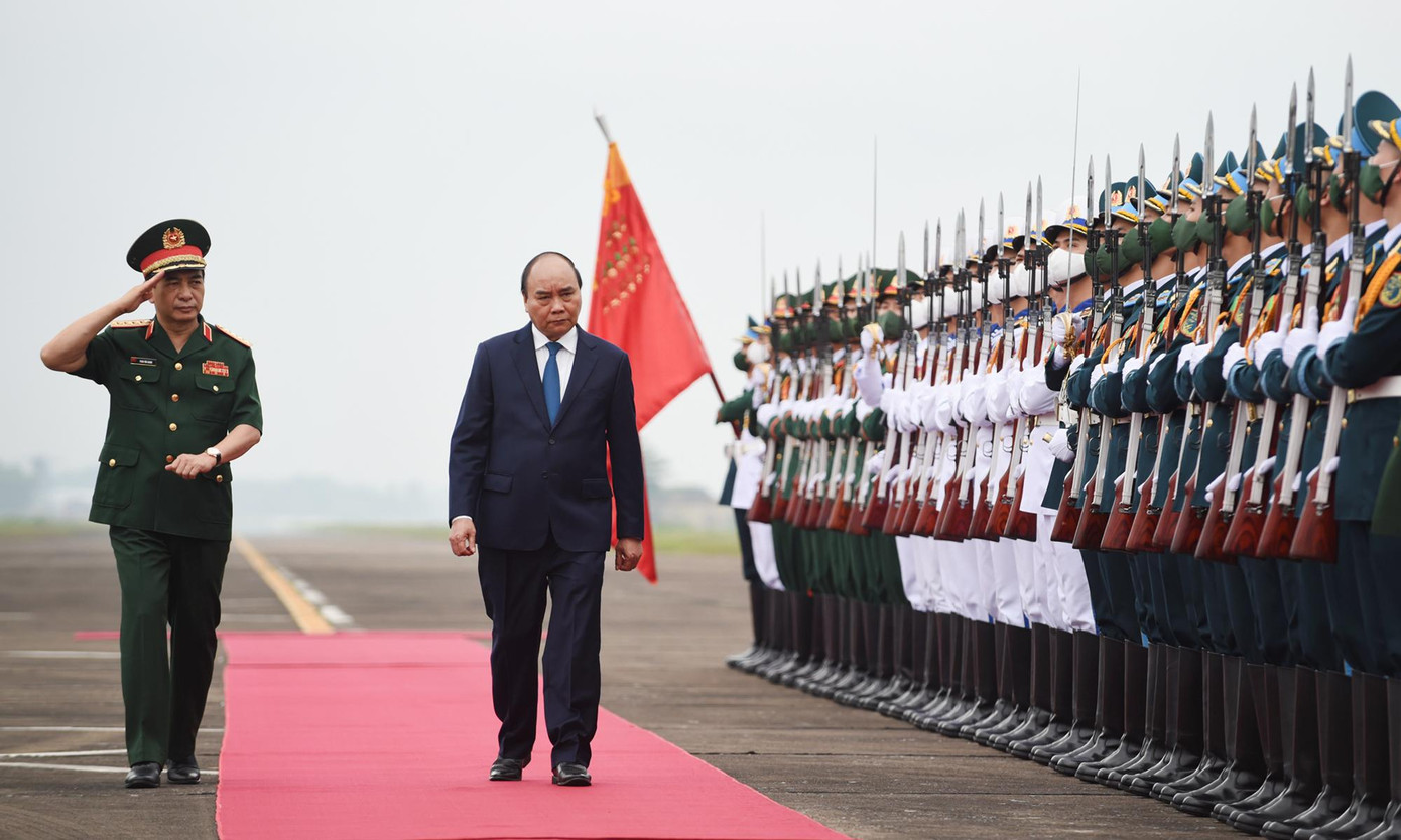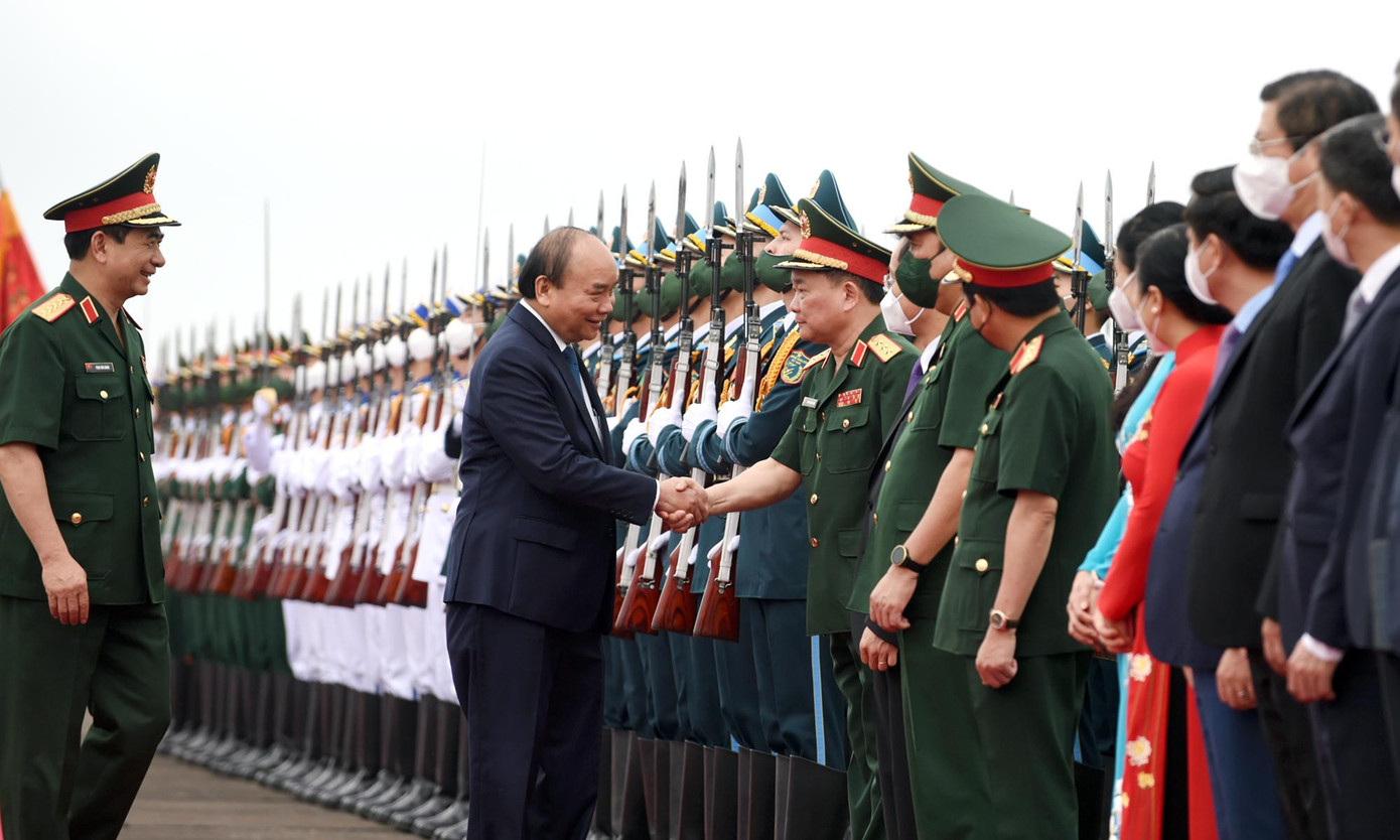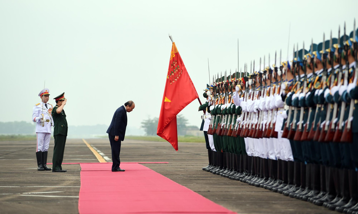 | Đại tướng Phan Văn Giang, Bộ trưởng Bộ Quốc phòng tháp tùng Chủ tịch nước Nguyễn Xuân Phúc duyệt Đội danh dự Quân đội nhân dân Việt Nam. |