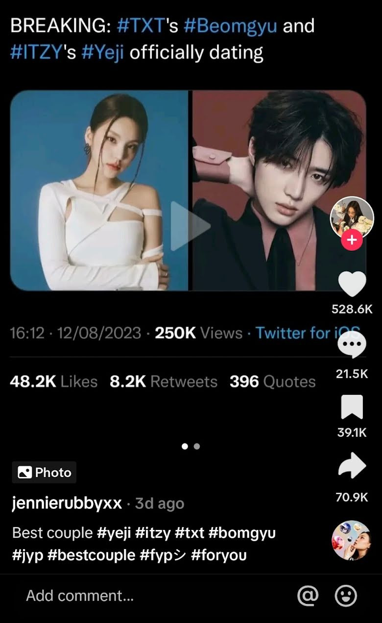 Một người dùng TikTok đã chia sẻ tiêu đề một bài báo được cho là từ ngày 12/8 thông báo rằng, Beomgyu của TXT và Yeji của ITZY đang “chính thức hẹn hò”, và chú thích: "Cặp đôi đẹp nhất".