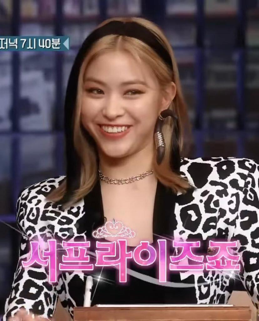 Nếu như Yeji chịu khổ vì trang điểm thì Ryu Jin lại thành nạn nhân của kiểu tóc không giống ai. Nếu nhìn qua, hẳn ai cũng nghĩ Ryu Jin đang đeo băng đô vải đúng không? Sự thực thì đó là hai lọn tóc giả được stylist gắn lên đầu Ryu Jin.