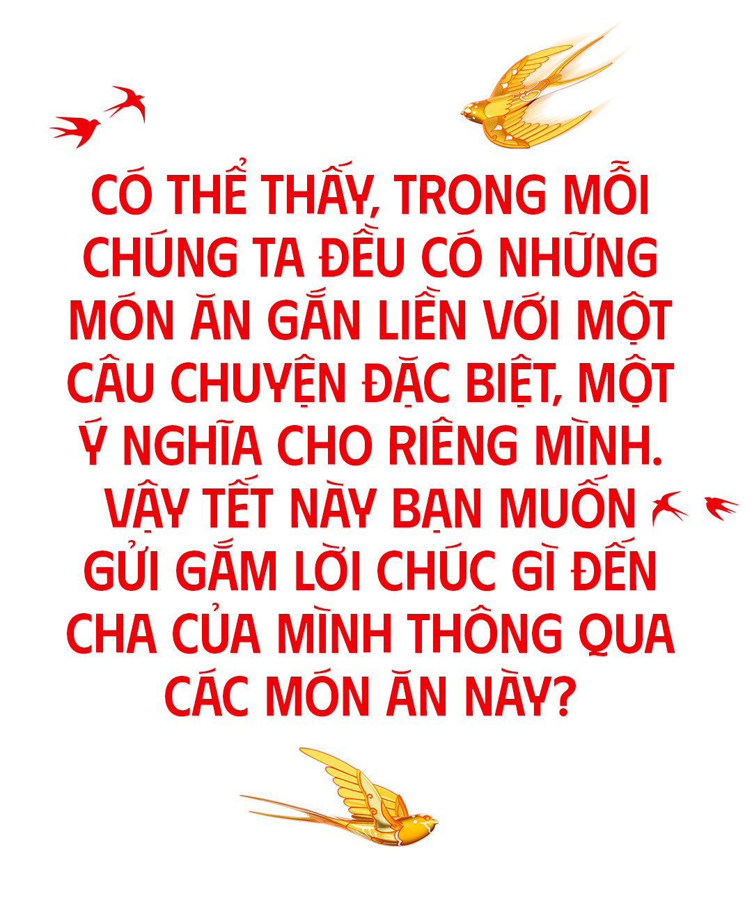 Năm nào mình cũng được đón Tết trọn vẹn cùng gia đình. Nhưng nếu được hỏi mình nhớ nhất điều gì, thì chắc chắn là những bữa ăn ngày Tết. Bởi lẽ, sau thời gian dài học tập, làm việc, điều đáng quý và trân trọng nhất chính là những bữa cơm sum họp gia đình, tận hưởng những tình yêu thương của gia đình nói chung, người cha nói riêng. Cho nên, cứ đến ngày Tết, mọi bữa cơm vào thời gian đó luôn khiến mình khắc ghi trong lòng.