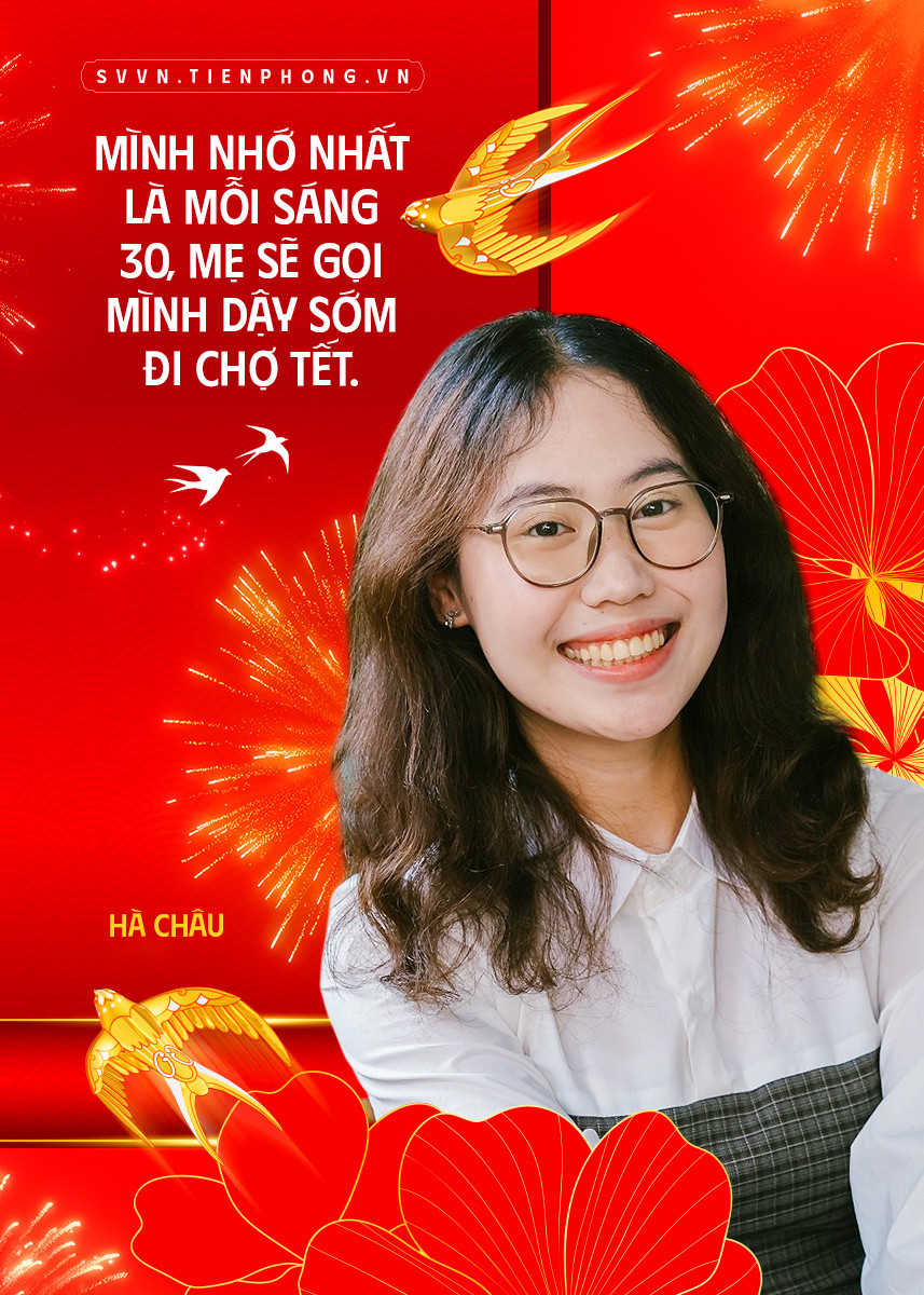 Mình nhớ nhất là mỗi sáng 30, mẹ sẽ gọi mình dậy sớm đi chợ Tết. Dù không cần mua nhiều vì đã chuẩn bị sẵn, nhưng mẹ muốn mình cảm nhận không khí rộn ràng, nô nức của ngày cuối năm. Lần nào cũng vậy, cảm giác ấy khiến mình nhớ đến bài thơ "Chợ Tết" thời tiểu học. Và một bát miến gà nóng hổi là món mình vẫn nhớ nhất trong mỗi dịp Tết. Đó là ước mong thầm kín của mẹ về sức khỏe của cả gia đình luôn dẻo dai như sợi miến, ấm áp tình yêu thương. Đó là những ký ức ấm áp mà mình luôn trân trọng.