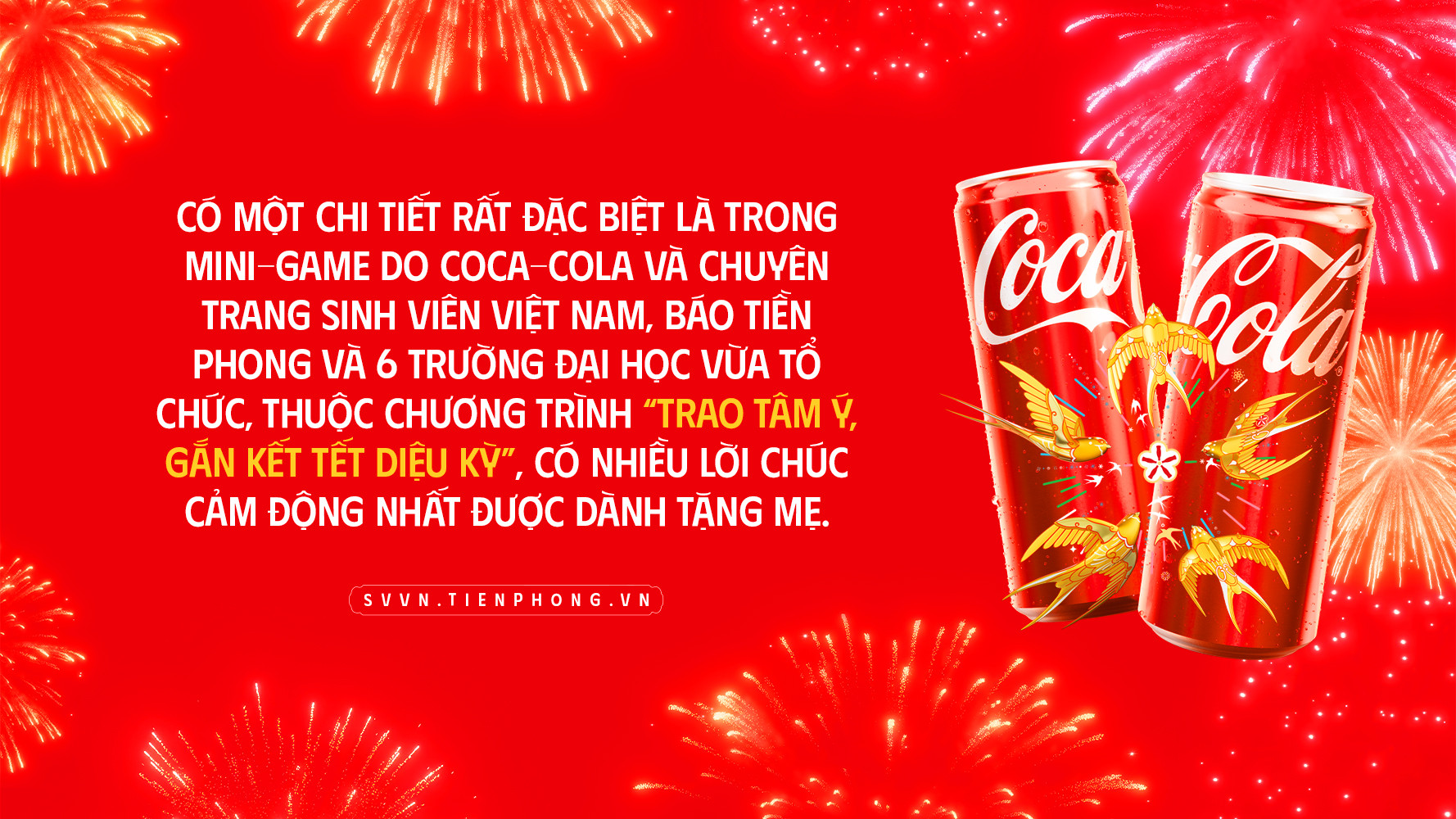 Những kỷ niệm nhỏ giữa mẹ và con này sẽ giúp các bạn trẻ mai này nghĩ về Tết, vẫn luôn cảm giác đây là quãng thời gian dù bận rộn nhưng quá đỗi ngọt ngào, đáng nhớ. Chương trình "Trao Tâm Ý, Gắn Kết Tết Diệu Kỳ" với mini-game Trao Tâm Ý, Nhận Lộc Hết Ý của Coca-Cola và Chuyên trang Sinh Viên Việt Nam, Báo Tiền Phong tổ chức dịp Tết Ất Tỵ 2025 là điểm nhấn thú vị giúp các bạn trẻ nhận ra ý nghĩa của những lời chúc chân thành đến mẹ của mình. Ngày đầu năm này, hãy cùng Coca-Cola gửi đi những lời chúc ý nghĩa đến những người mình yêu thương thông qua trang Trao Tâm Ý, cùng gắn kết Tết diệu kỳ nhé!