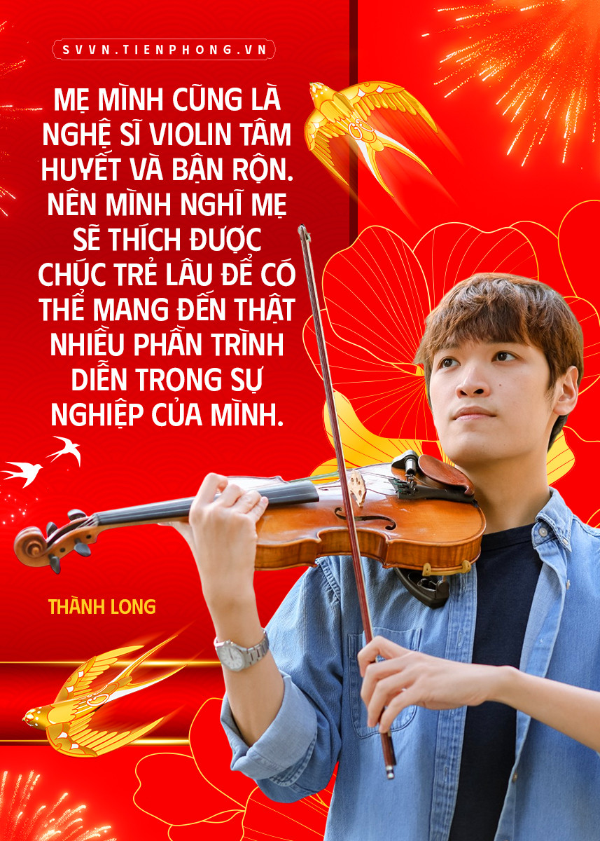 Mẹ mình cũng là nghệ sĩ violin tâm huyết và bận rộn. Nên mình nghĩ mẹ sẽ thích được chúc trẻ lâu để có thể mang đến thật nhiều phần trình diễn trong sự nghiệp của mình. (Cười)
