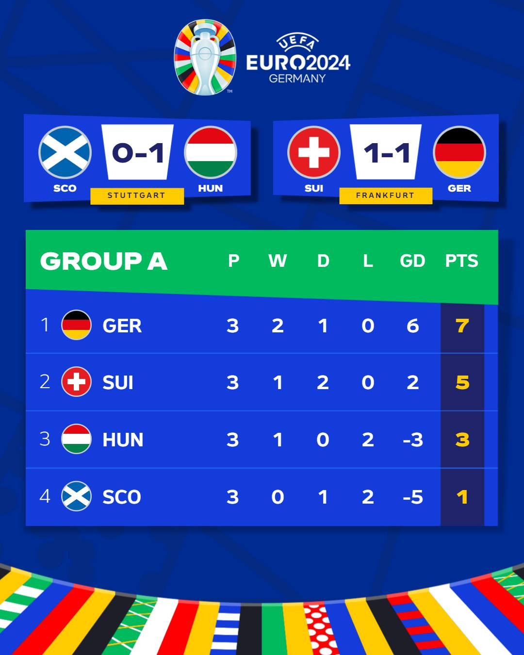 Thắng 1-0, Hungary chiếm vị trí thứ 3 bảng A của Scotland. Dù vậy, cơ hội đi tiếp của họ vẫn chưa rõ ràng. Hungary chỉ có 3 điểm trong khi hiệu số bàn thắng thua là -3 bàn. Họ sẽ phải chờ kết quả các bảng đấu còn lại để biết số phận của mình.