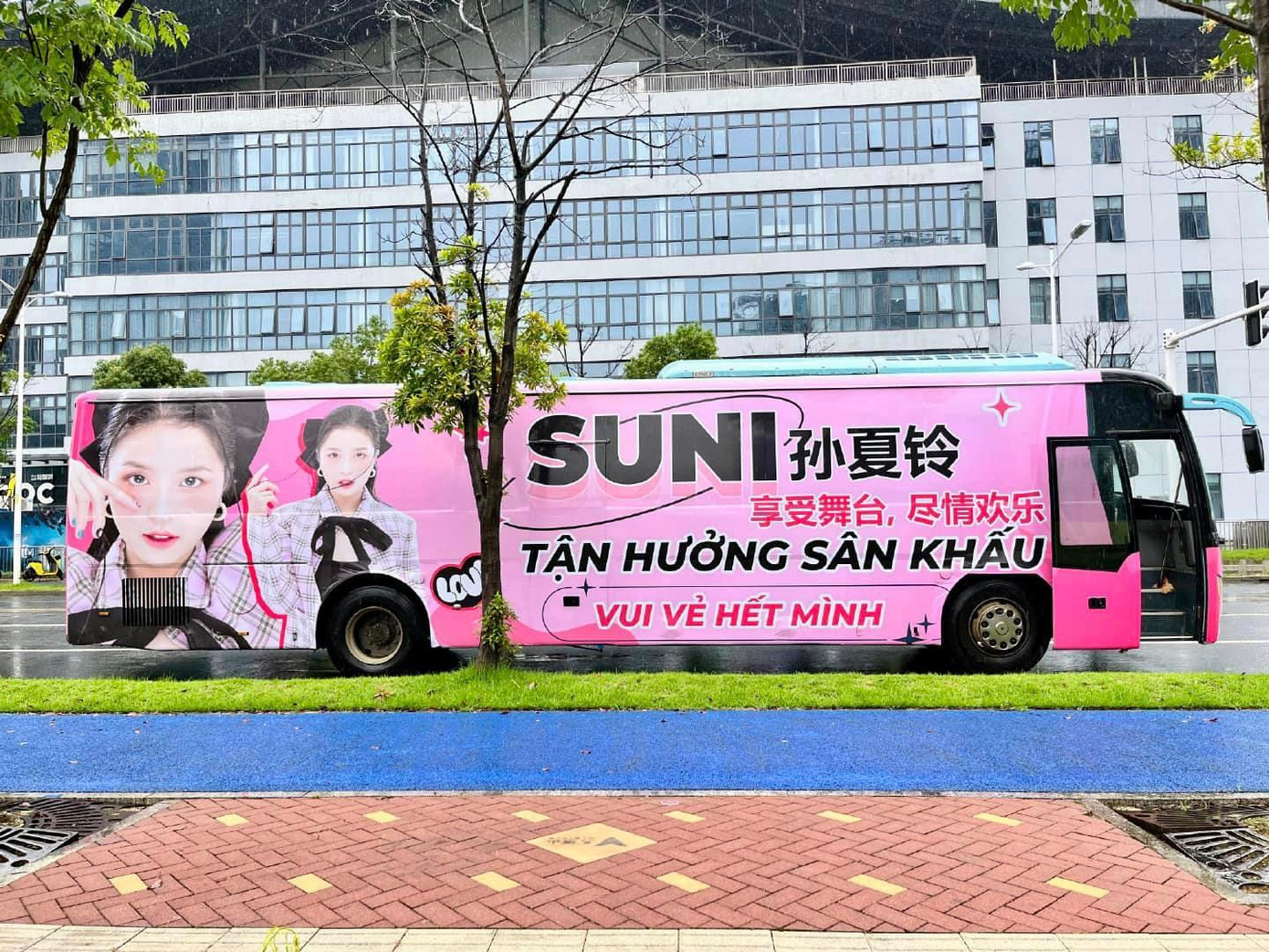 | Suni Hạ Linh tranh thủ check-in cùng standee và xe buýt mà fan chuẩn bị. |