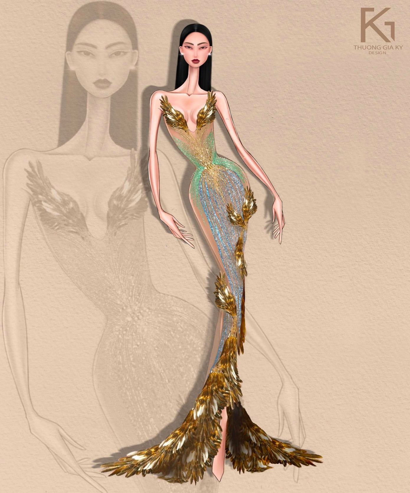 Hóa ra đây là một thiết kế của Thượng Gia Kỳ. Anh đã chọn hai màu xanh lá và vàng, cũng là tông màu truyền thống của Miss Grand International để tạo nên bộ váy này. Ba năm trước, Thùy Tiên cũng từng đăng quang trong một mẫu váy dạ hội mang hai màu sắc này nên nhiều thí sinh xem xanh lá và vàng là màu may mắn khi tham dự Miss Grand International.