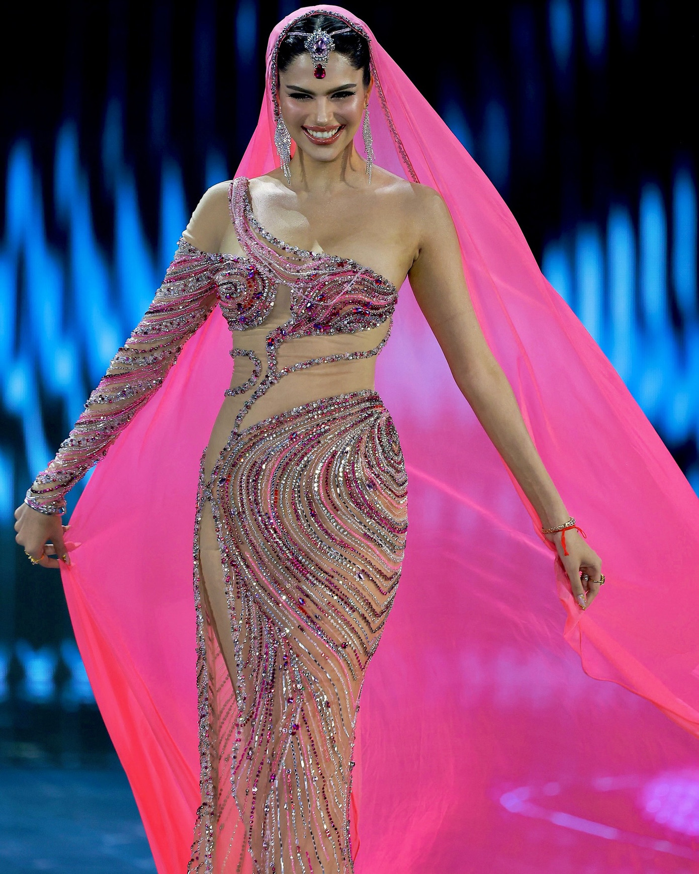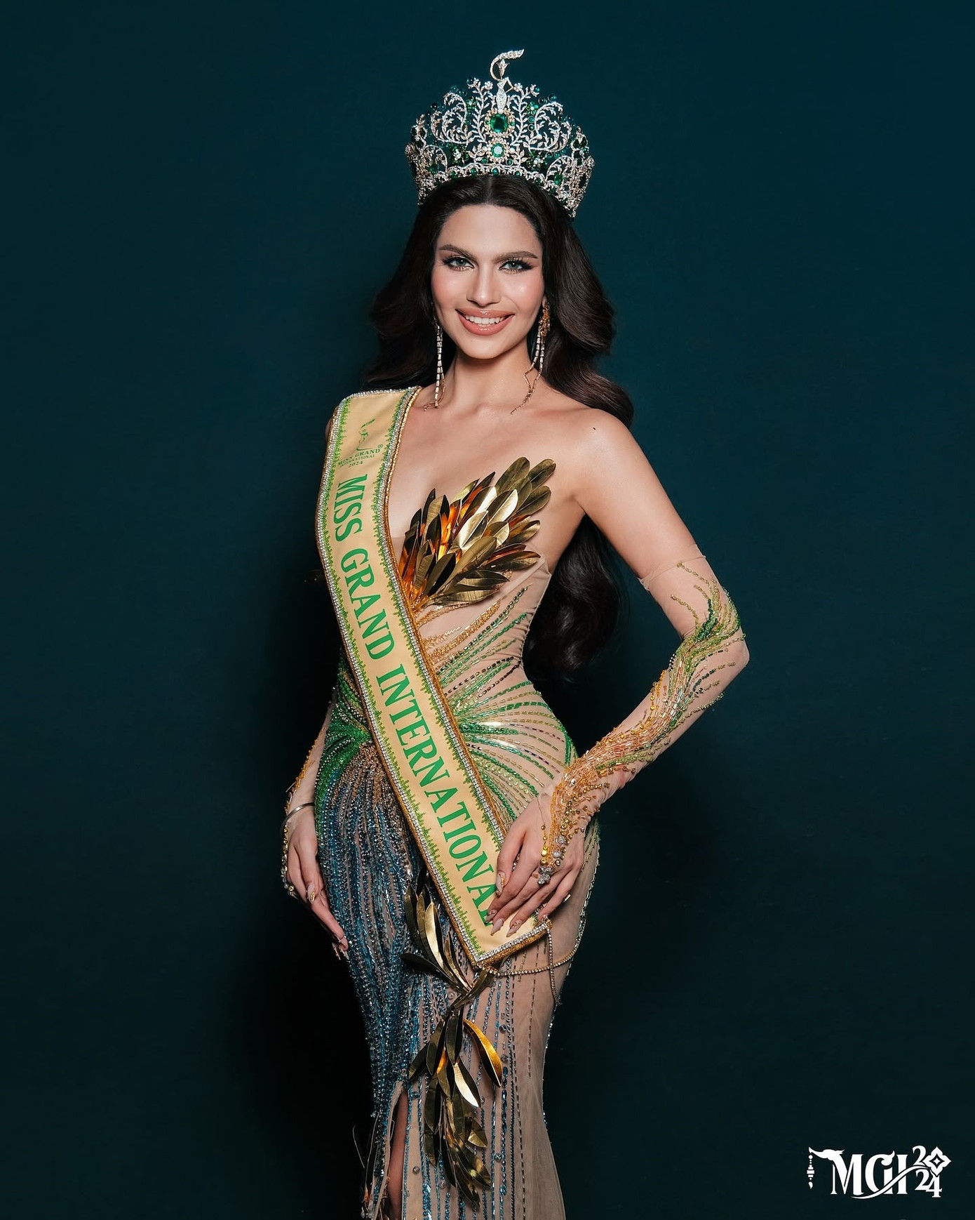 Đêm Chung kết Miss Grand International 2024 cũng chính là thời khắc Hoa hậu Luciana Fuster thực hiện final walk trước khi trao lại vương miện cho người kế nhiệm. Cô được khen lộng lẫy như công chúa trong một bộ đầm lấp lánh của NTK Nguyễn Minh Tuấn thực hiện.