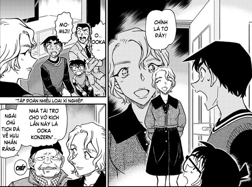 Truyện tranh Thám Tử Lừng Danh Conan mang đến vụ án mới dự kiến kéo dài 5 chương, xoay quanh án mạng tại đoàn kịch Osaka. Lúc này, nhóm của Conan, Heiji, Ran, Kogoro và Kazuha đang xem một vở kịch. Các nhân vật trong kịch lấy cảm hứng từ người thật, bao gồm Daigoro (nhái Kogoro), Heiichi (nhái Heiji), Ochiba (nhái Kazuha) và Kaede (nhái Momiji).