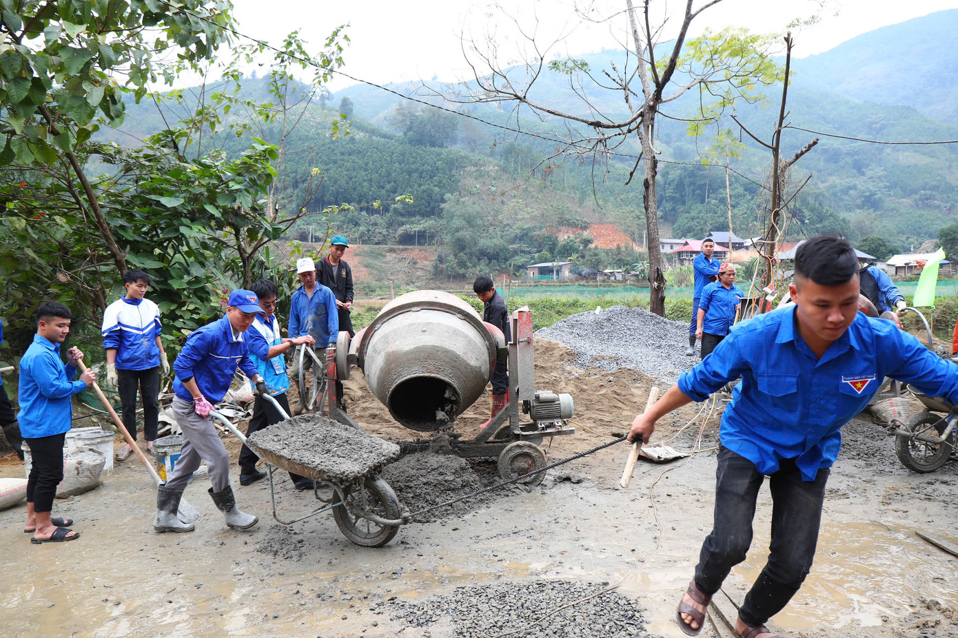 | Đoàn viên thanh niên tham gia thực hiện công trình đường bê tông liên gia tại xã Nậm Lúc, huyện Bắc Hà, tỉnh Lào Cai. |