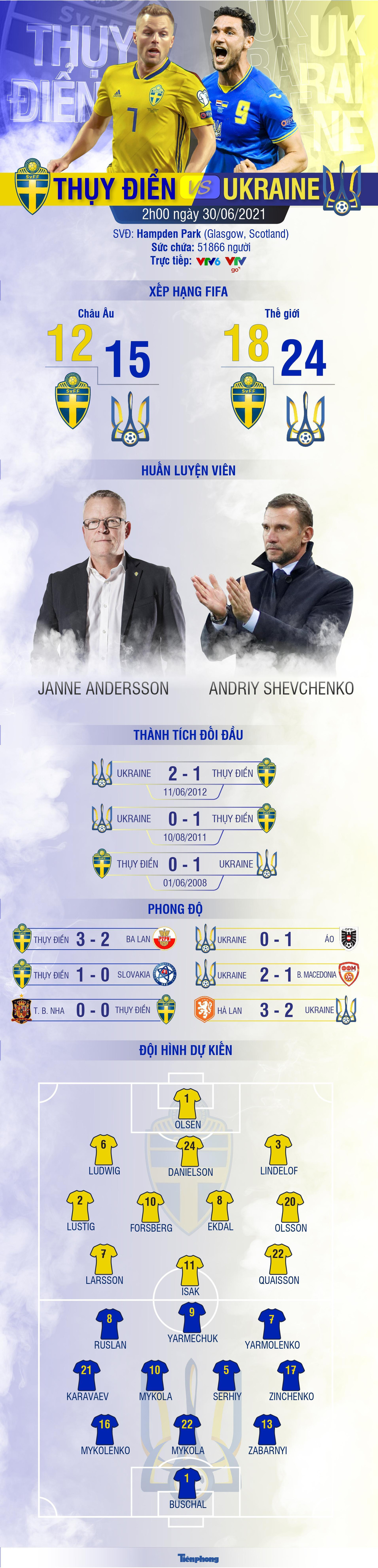 Vòng 1/8 EURO đang dần khép lại. Trận đấu cuối cùng vòng đấu này sẽ là cuộc so tài giữa Thuỵ Điển và Ukraine vào lúc 2h ngày 30/6 trên sân vận động Hampden Park (Scotland).