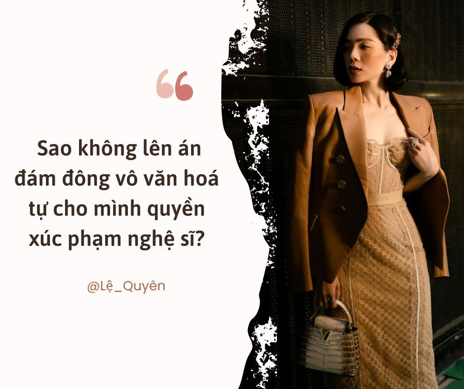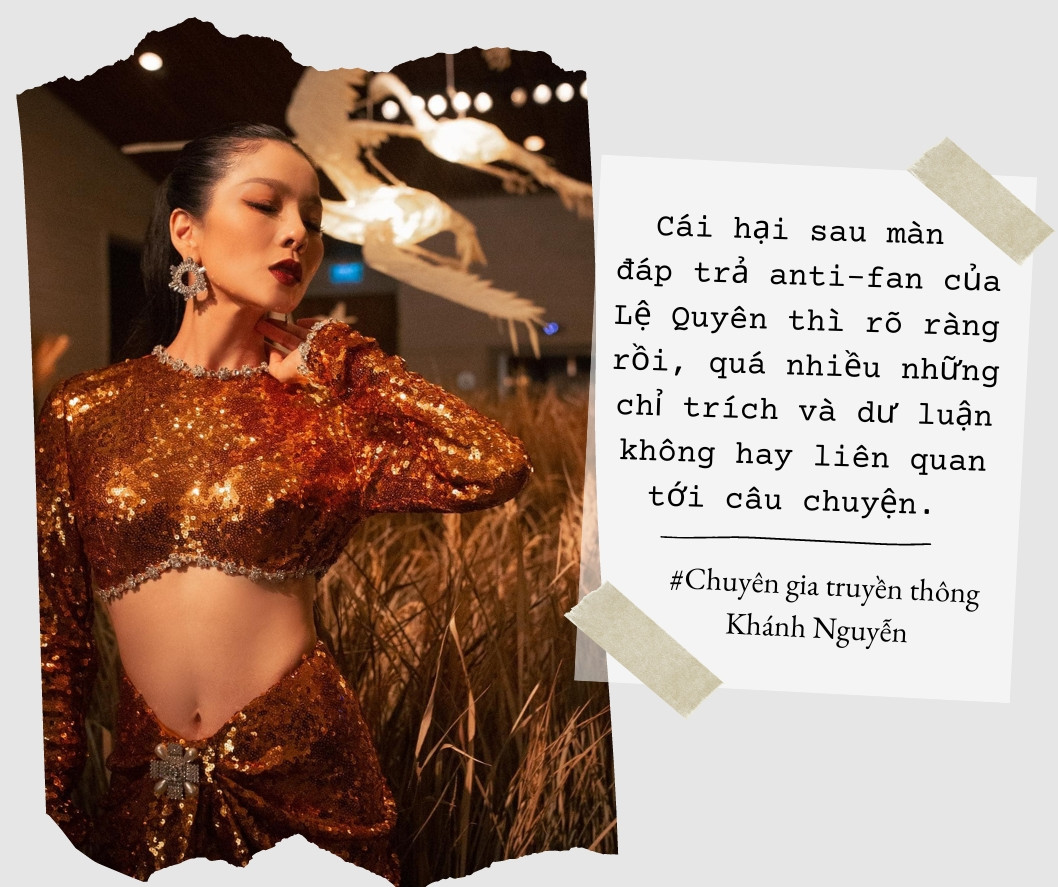 Cô gọi một bộ phận cư dân mạng là "đám đông vô văn hóa tự cho mình cái quyền xúc phạm nghệ sĩ" và khẳng định dù nghệ sĩ có sai cũng không có nghĩa cư dân mạng được phép chửi mắng "bậy bạ" và "mất dạy". Lệ Quyên còn cho rằng một số người chọn im lặng trước mọi tranh cãi là vì sợ quá nhiều thứ chứ không phải vì cao sang hay cao thượng. Bản thân cô chọn cãi tay đôi với anti-fan vì dù cô là nghệ sĩ nhưng sự nhẫn nhịn của cô cũng có điểm dừng.