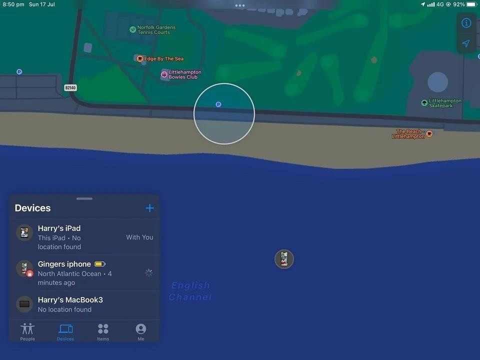 Theo bài đăng trên Reddit, một người đã làm rơi chiếc iPhone của mình tại Bắc Đại Tây Dương khi đang chèo ván. Sau khi thủy triều rút 7 giờ sau, thiết bị đã tự bật trở lại. Nhờ Find My mà chiếc iPhone này đã được theo dõi - ngay cả khi ở dưới đáy đại dương.