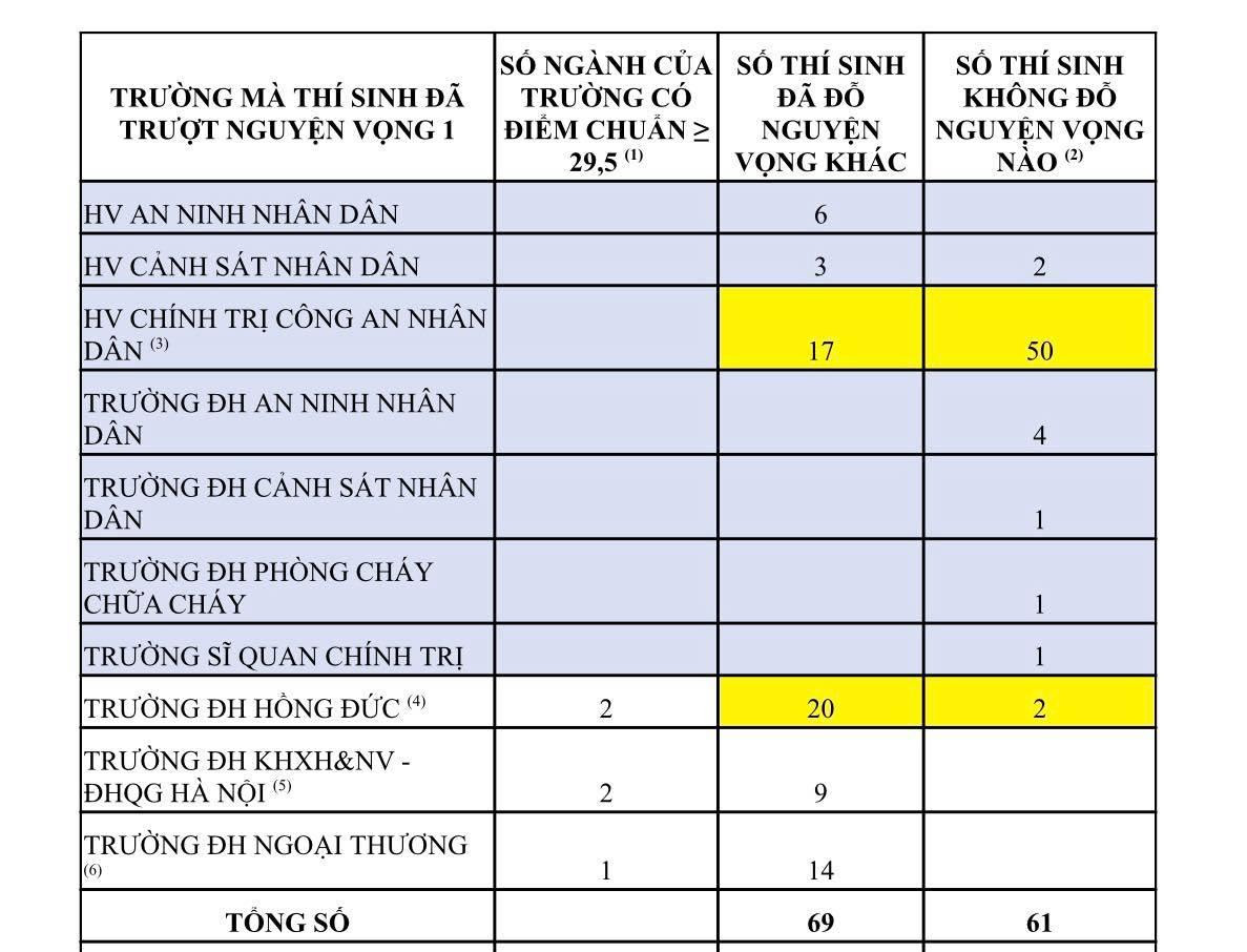 Trong 61 em không trúng tuyển nguyện vọng nào: Có 60 em chỉ đặt duy nhất 01 nguyện vọng, chỉ có 1 em đặt 02 nguyện vọng; 59 em có NV1 vào các trường công an, quân đội và đều chỉ có 01 nguyện vọng, trong đó 57 em tốt nghiệp từ năm 2019 trở về trước (có lẽ thuộc đối tượng đã đi nghĩa vụ nay được cử đi thi).