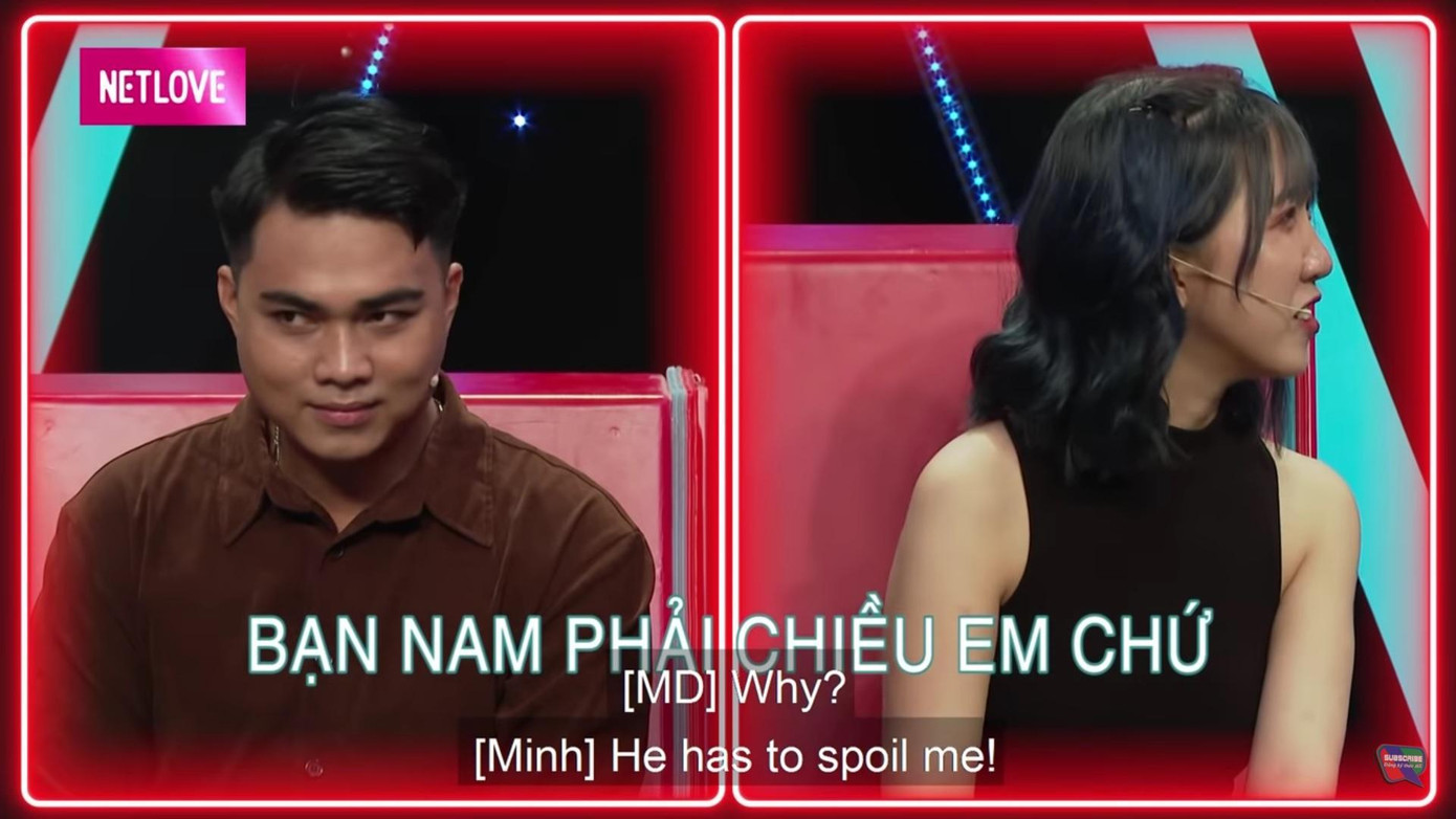 "Tôi có 12 mối tình, có 4 mối là sâu sắc còn lại chỉ dừng ở mức tìm hiểu, cao nhất là 1 năm còn thấp nhất là một ngày. Đẹp trai là một tiêu chí. Tôi muốn bạn nam chi tiền cho tôi để mua đồ, đầu tư chứng khoán, bất động sản. Trai cho tiền mình đi đầu tư, rồi mình chia tiền lại cho trai. Đi ăn nếu bạn trai quên bóp thì tôi có thể cà thẻ trả rồi đợt sau bạn cà lại nhưng quên lần 2 là thôi bye luôn”, cô gái bộc bạch khiến hai MC Cát Tường và Hứa Minh Đạt lắc đầu chịu thua.