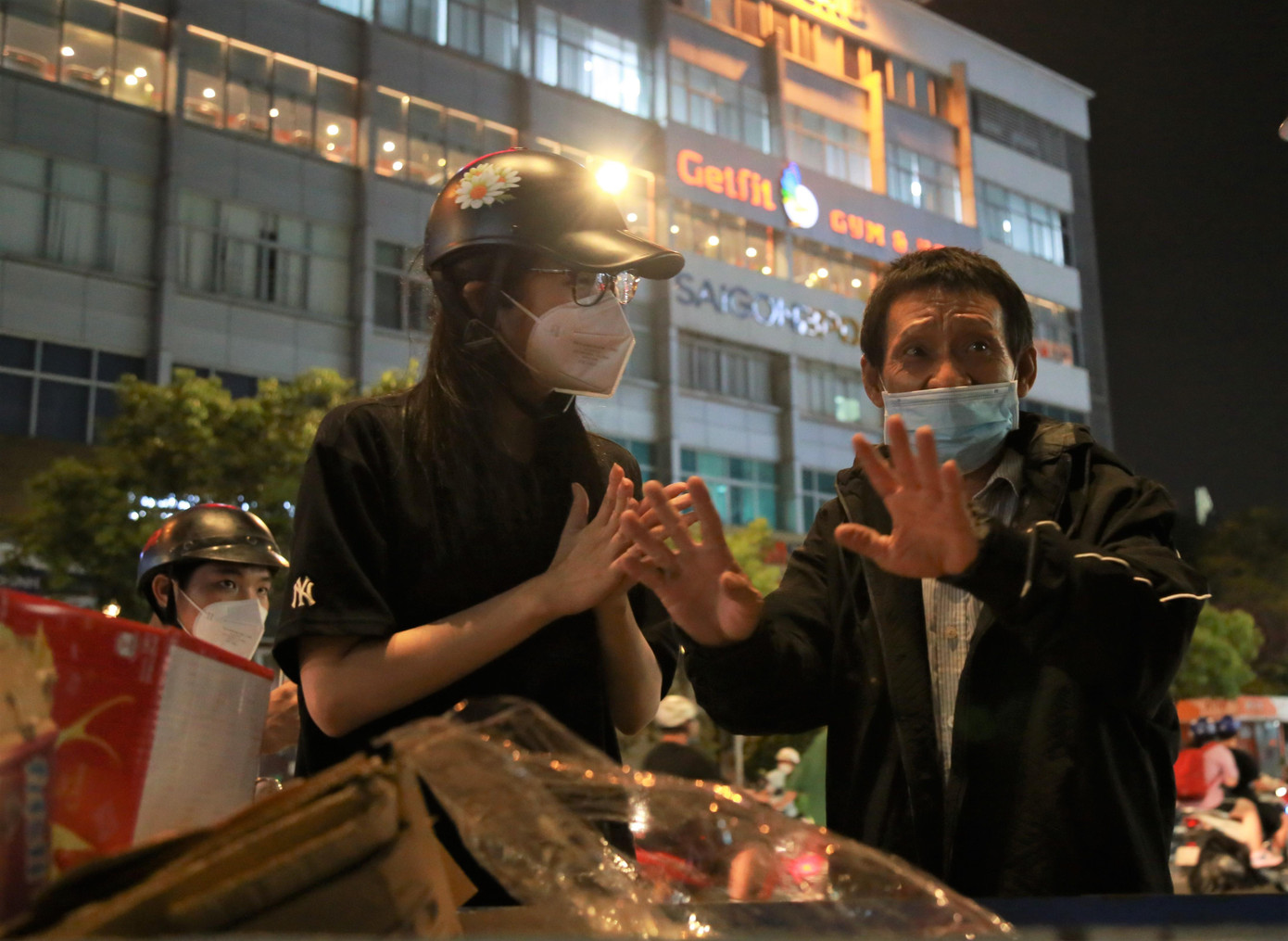 | Phương chia sẻ với người đàn ông bán trái me ở góc vỉa hè trong đêm. |